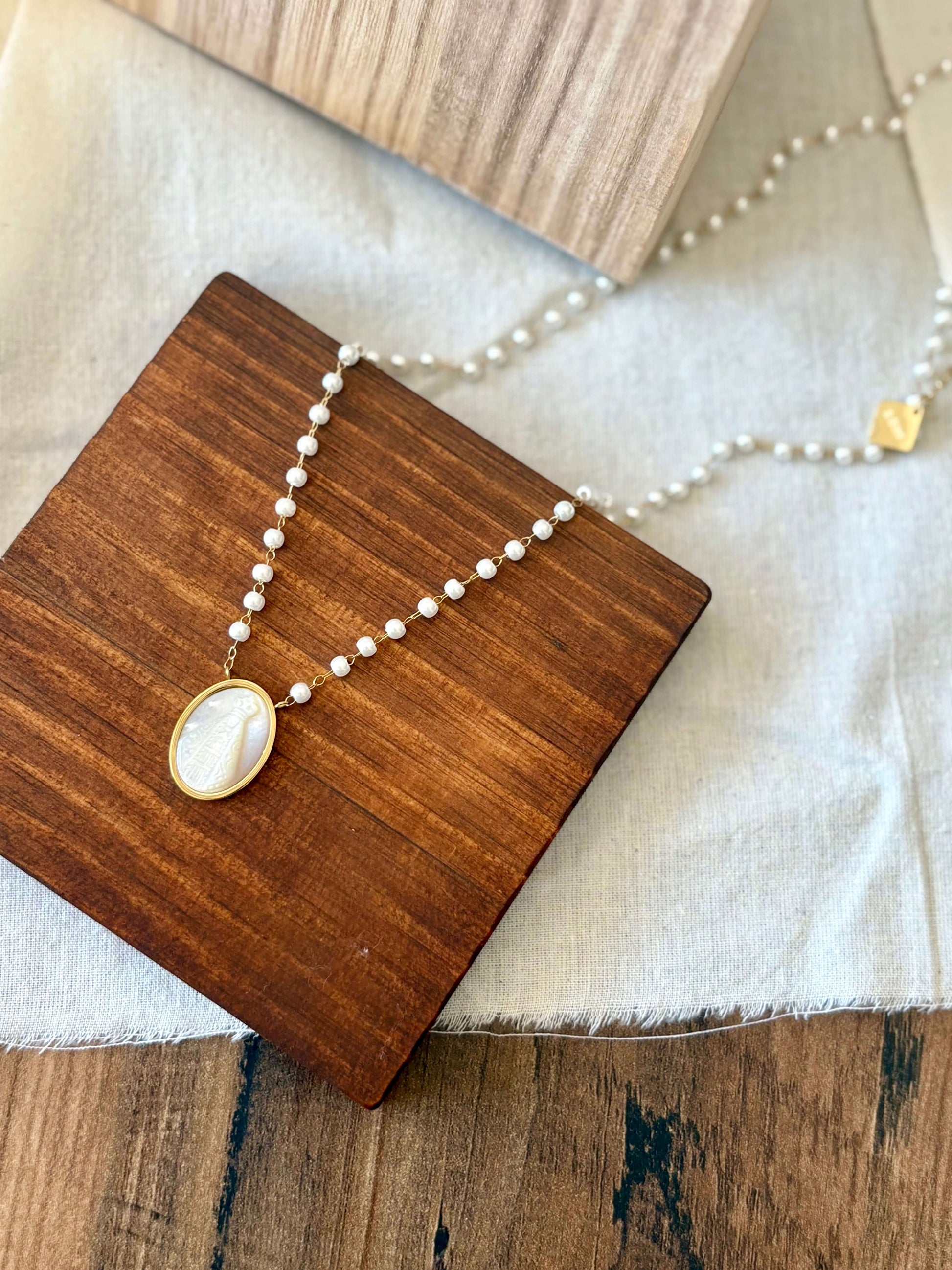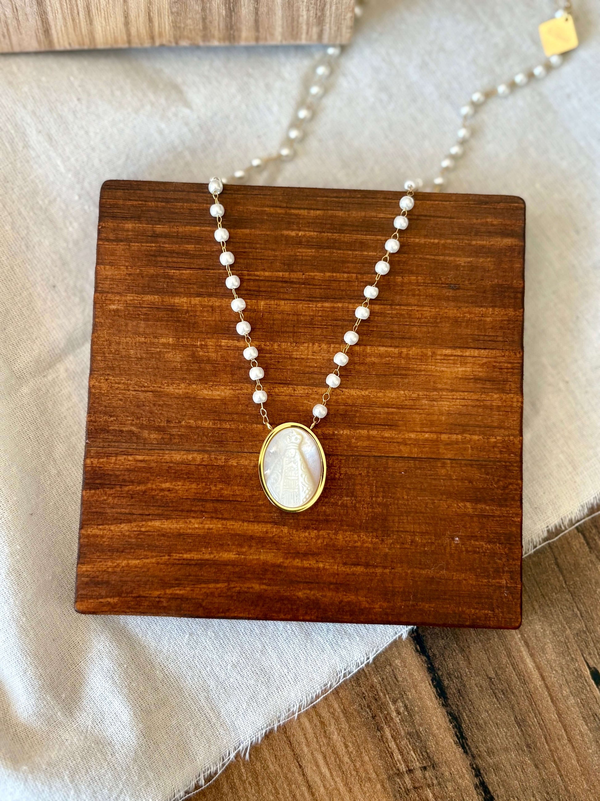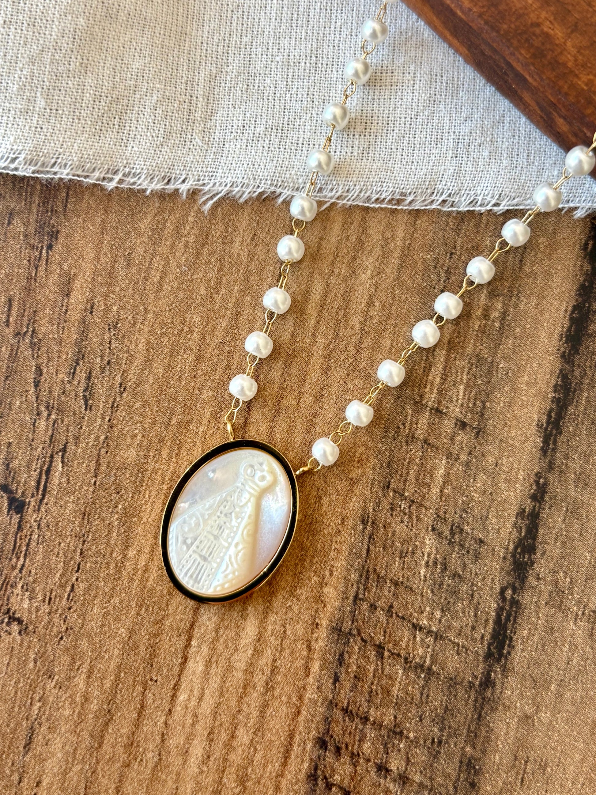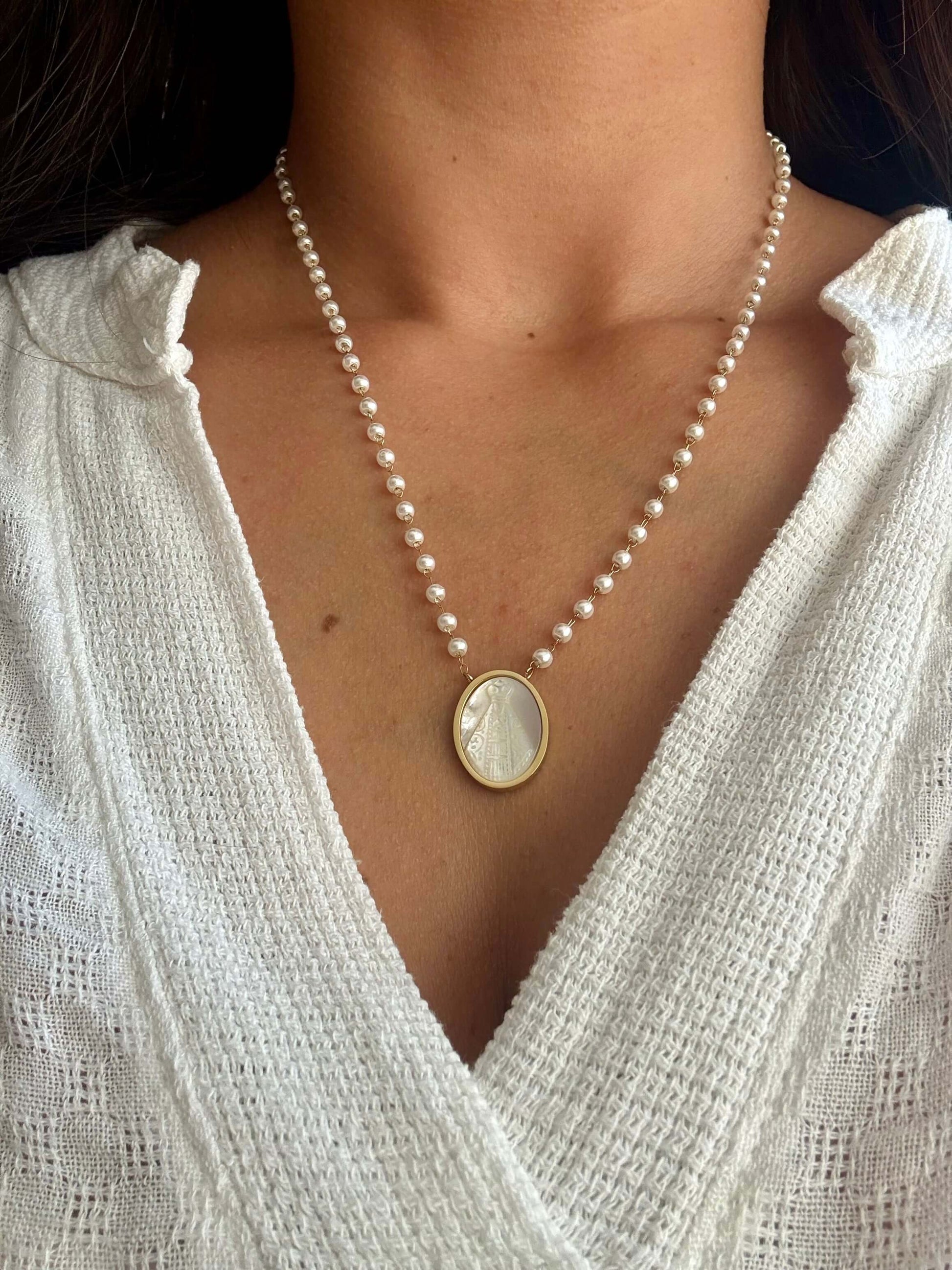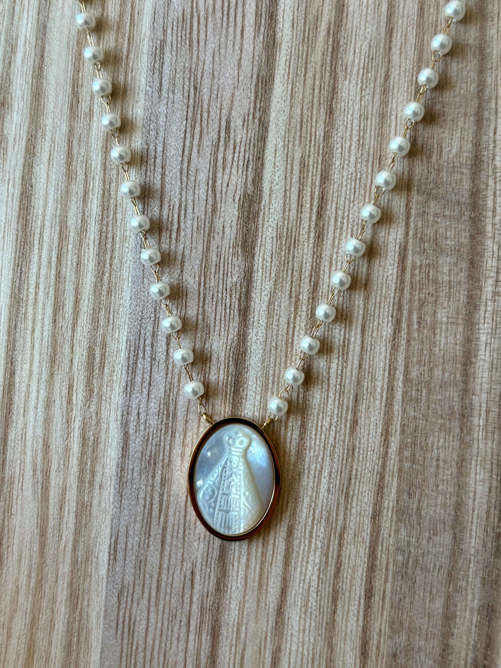 Um acessório que une delicadeza, fé e sofisticação. Este colar conta com um fio de pérolas que transmite elegância intemporal e um pendente oval em madrepérola, com detalhe religioso em relevo, emoldurado em dourado. Mais que uma simples jóia, é uma peça que carrega significado espiritual e que pode acompanhá-la do dia-a-dia ou em ocasiões especiais.