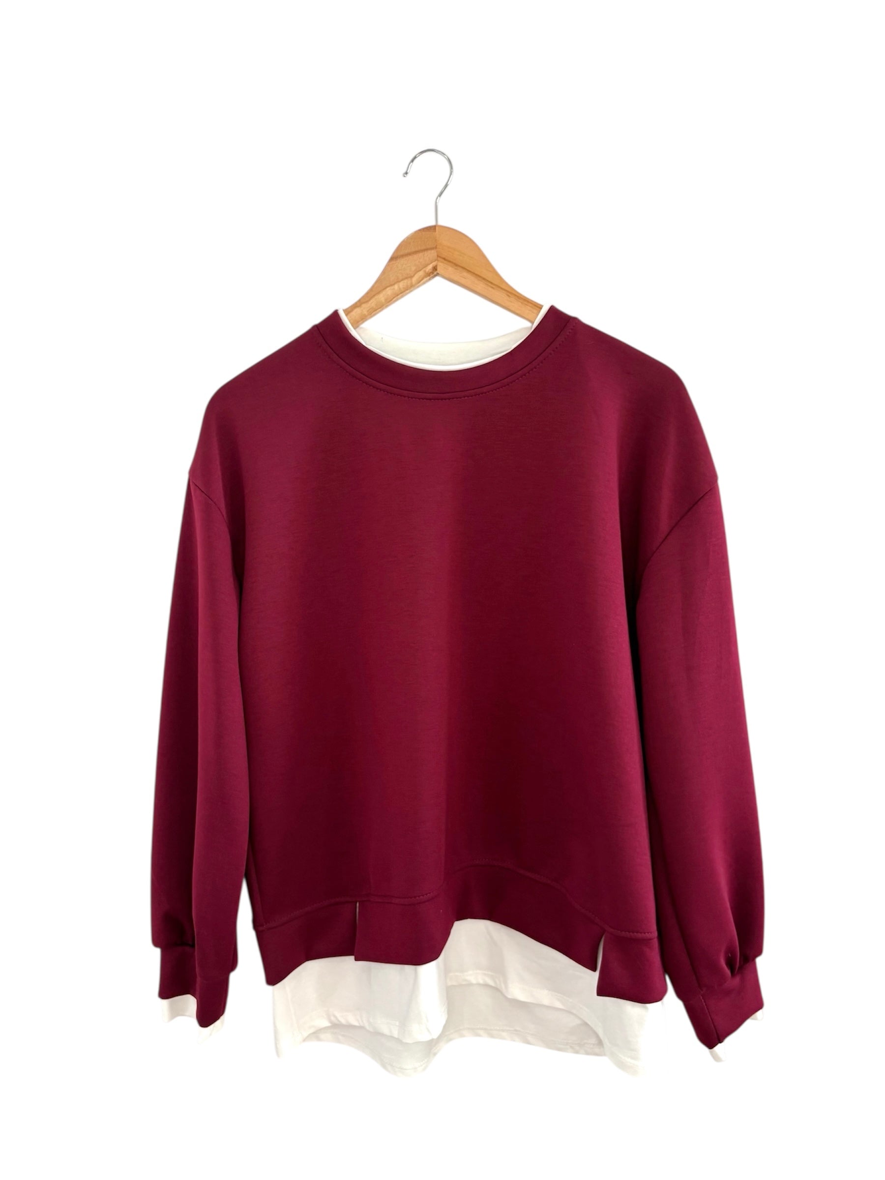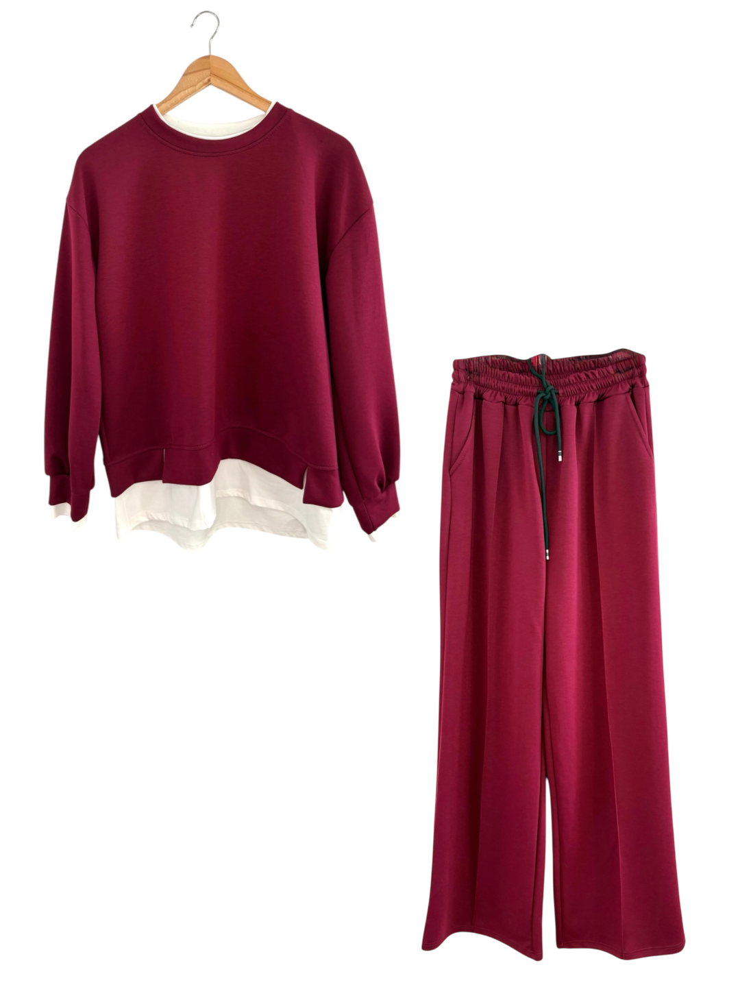 Conforto e estilo num só look! Este fato de treino combina umas calças largas e confortáveis com uma camisola com efeito sobreposto de tshirt por baixo - o toque que faz toda a diferença! Feito em tecido macio e respirável, é perfeito para usar no dia-a-dia. Combine-o com os acessórios certos e dê-lhe um toque ainda mais especial!