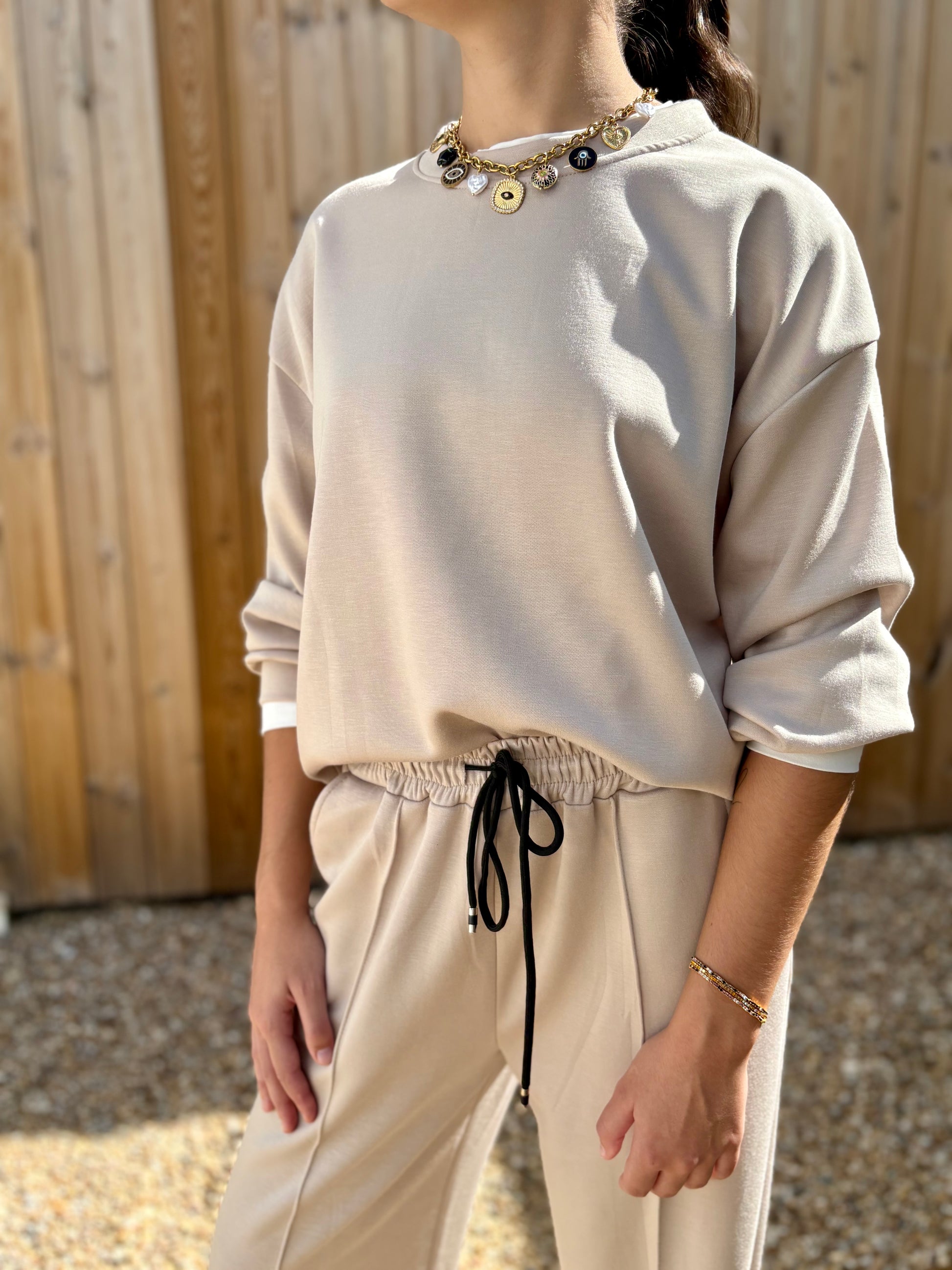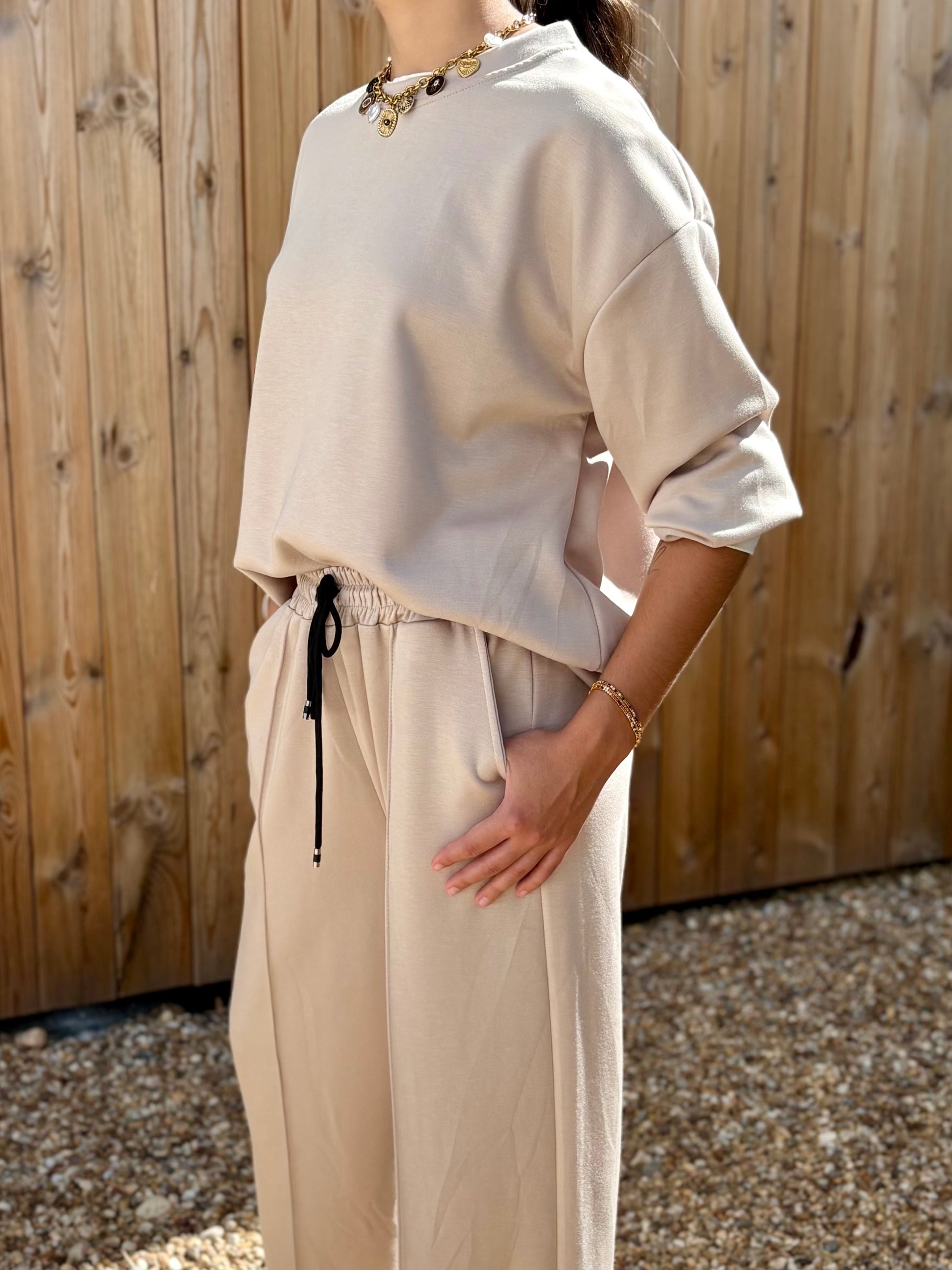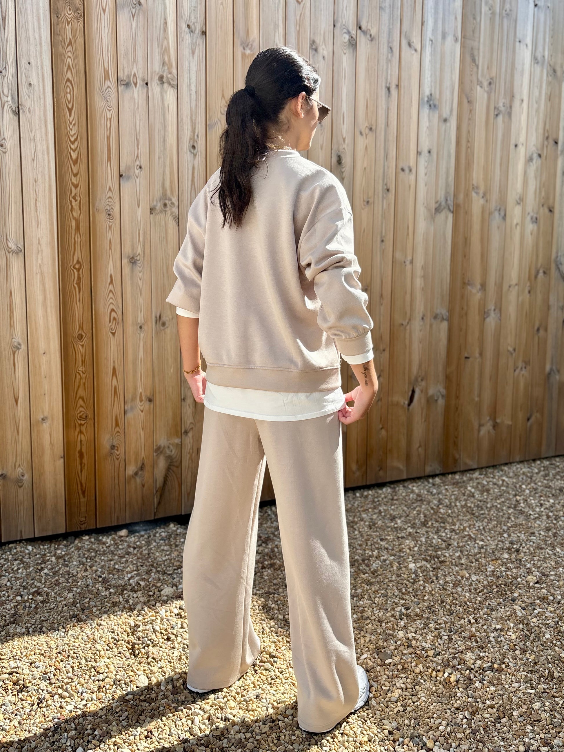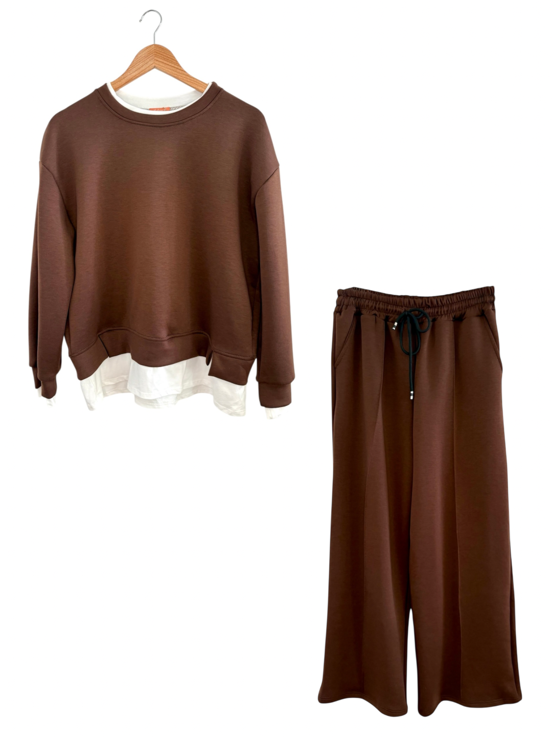 Conforto e estilo num só look! Este fato de treino combina umas calças largas e confortáveis com uma camisola com efeito sobreposto de tshirt por baixo - o toque que faz toda a diferença! Feito em tecido macio e respirável, é perfeito para usar no dia-a-dia. Combine-o com os acessórios certos e dê-lhe um toque ainda mais especial!