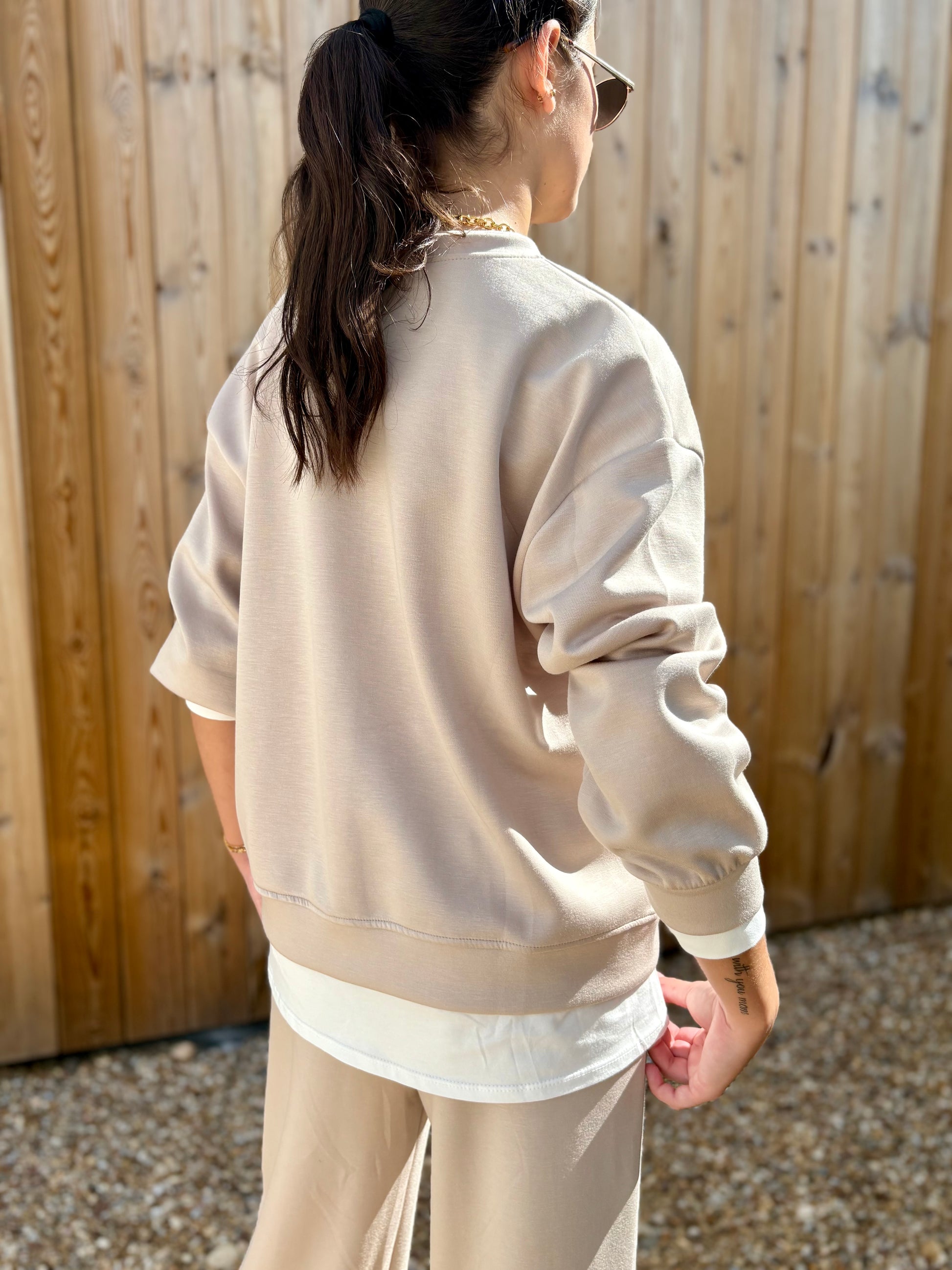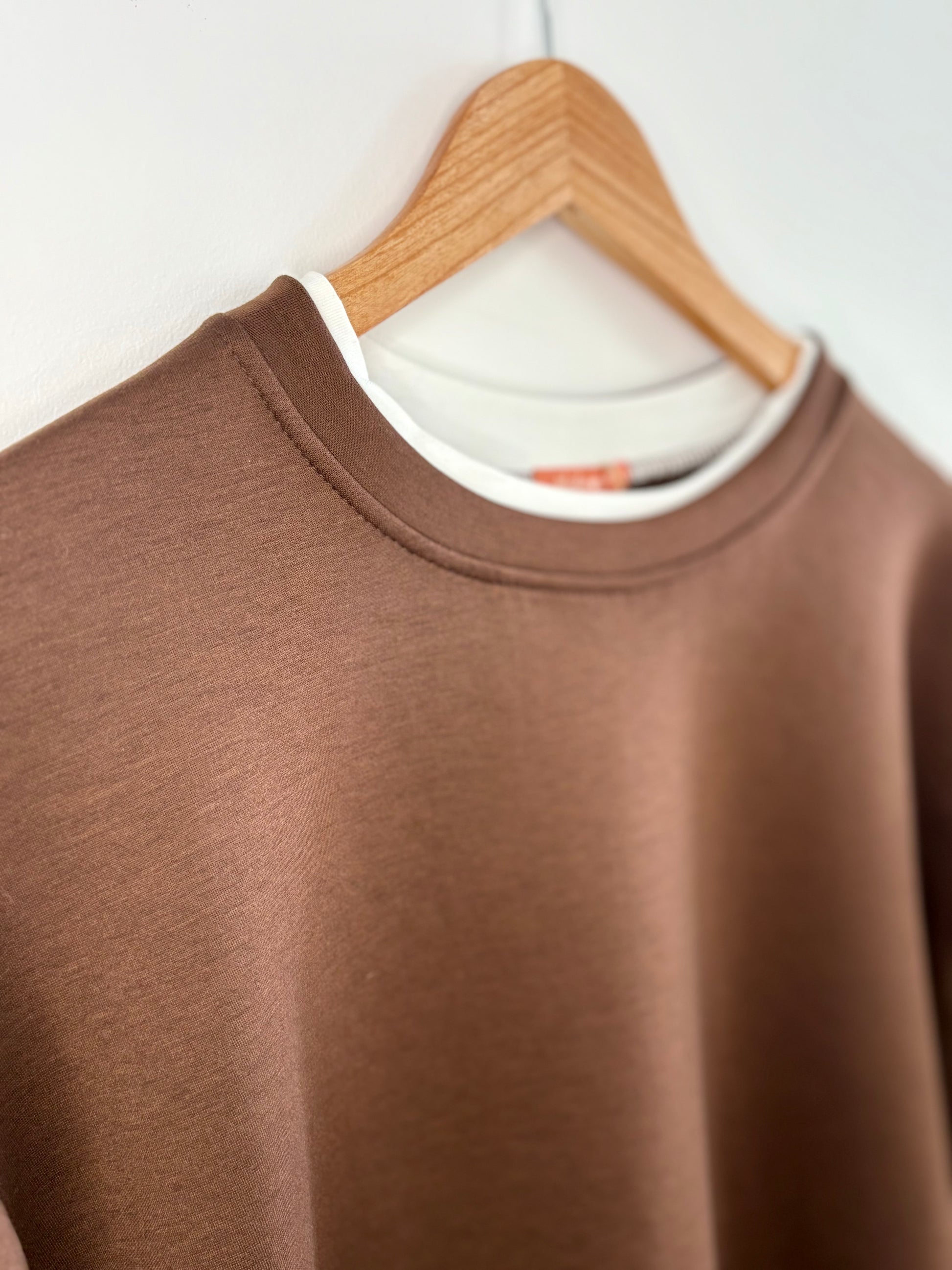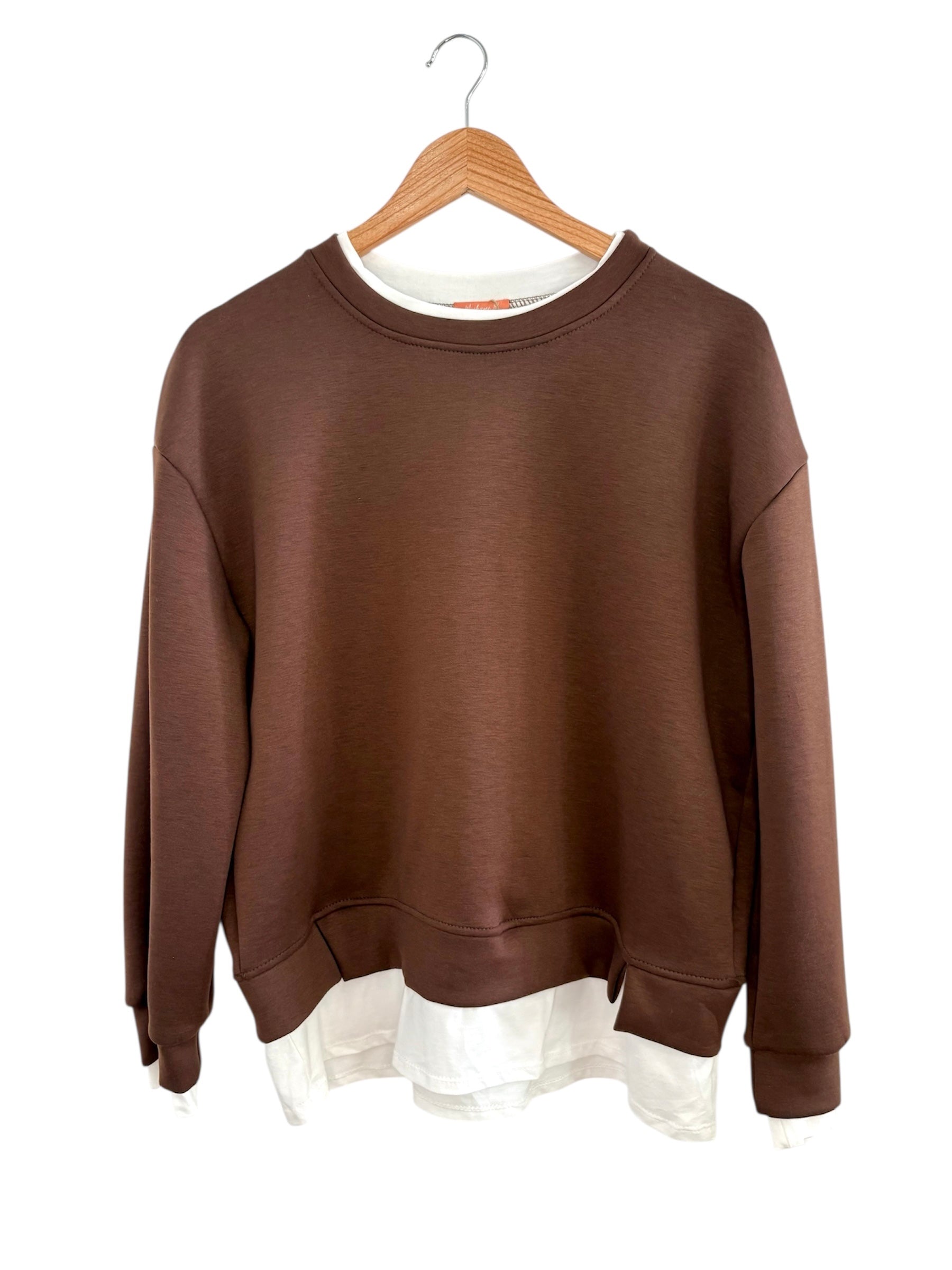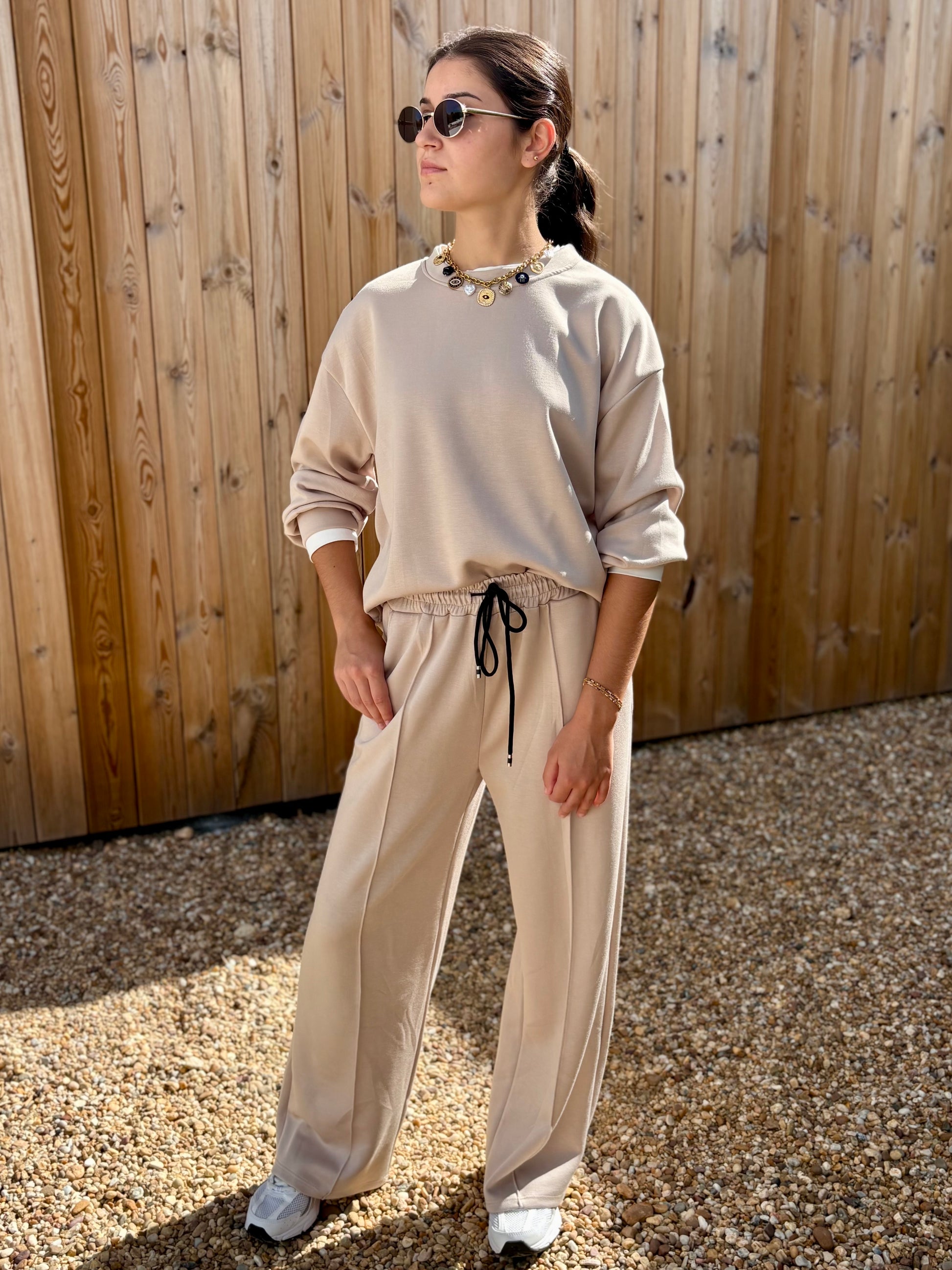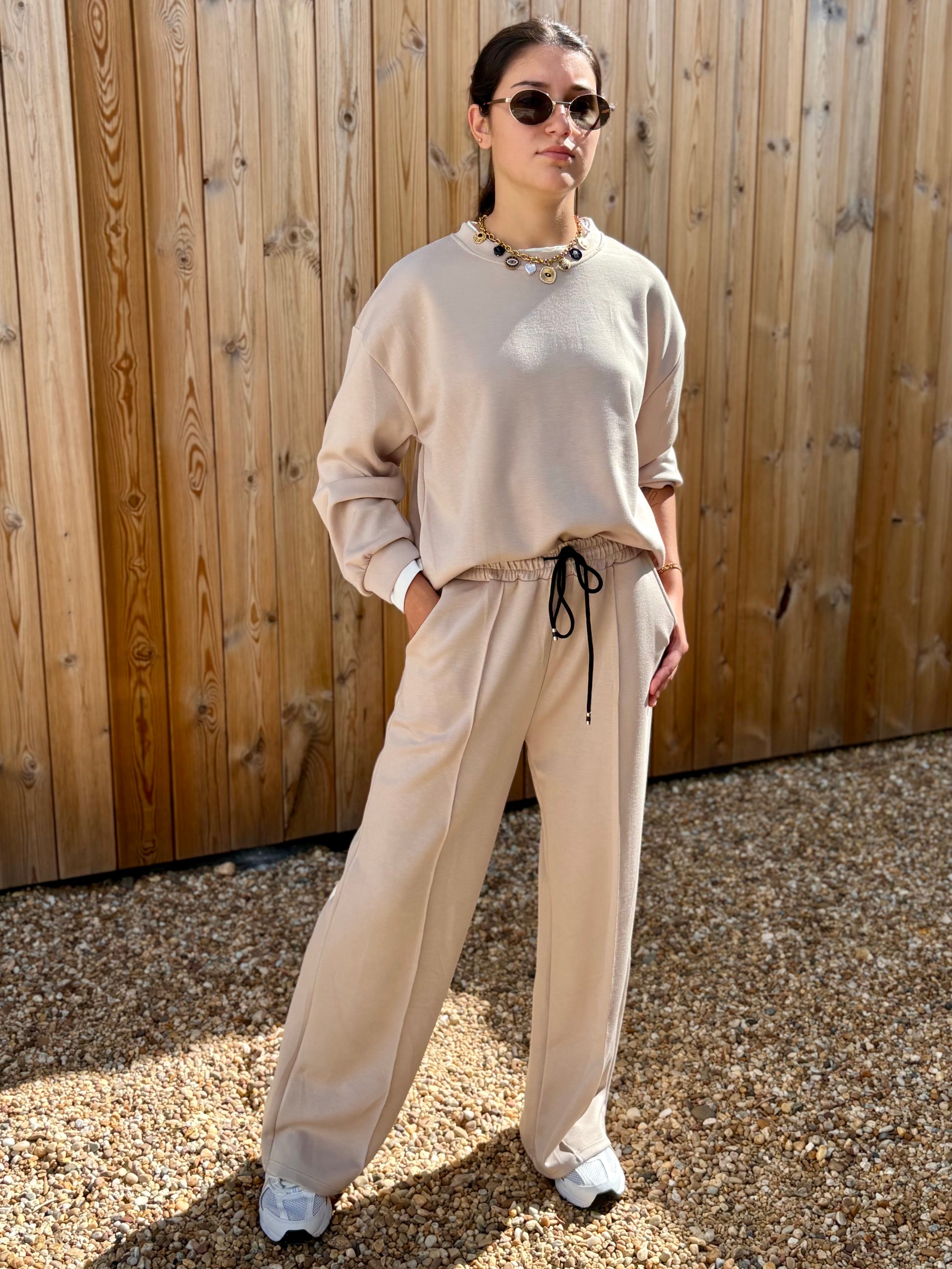 Conforto e estilo num só look! Este fato de treino combina umas calças largas e confortáveis com uma camisola com efeito sobreposto de tshirt por baixo - o toque que faz toda a diferença! Feito em tecido macio e respirável, é perfeito para usar no dia-a-dia. Combine-o com os acessórios certos e dê-lhe um toque ainda mais especial!