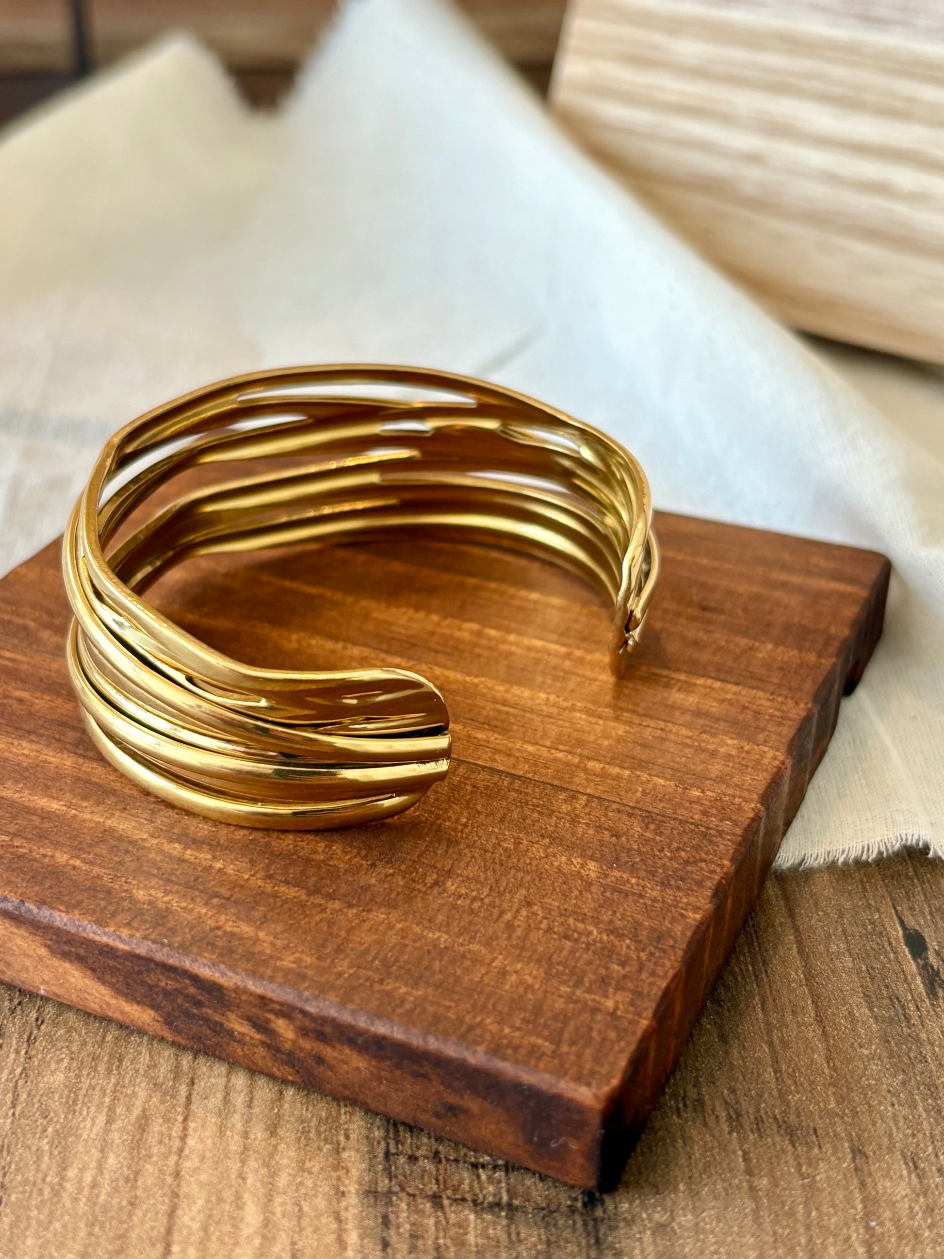 Com um design elegante e contemporâneo, esta pulseira rígida dourada reproduz o efeito de várias pulseiras finas sobrepostas, criando um visual moderno numa só peça! O seu acabamento polido realça o brilho e dá-lhe presença, tornando-a no acessório ideal para quem procura sofisticação e praticidade.
