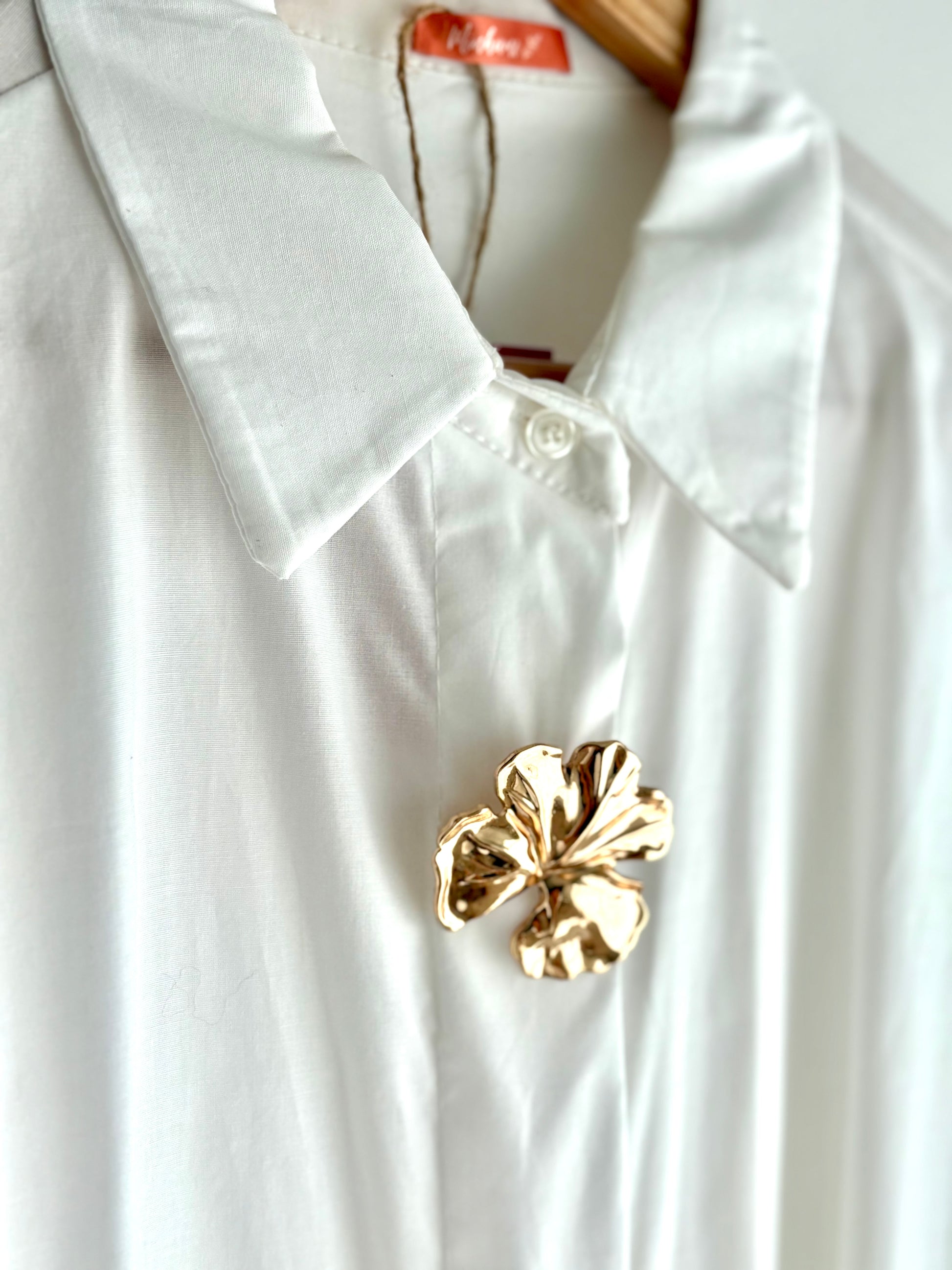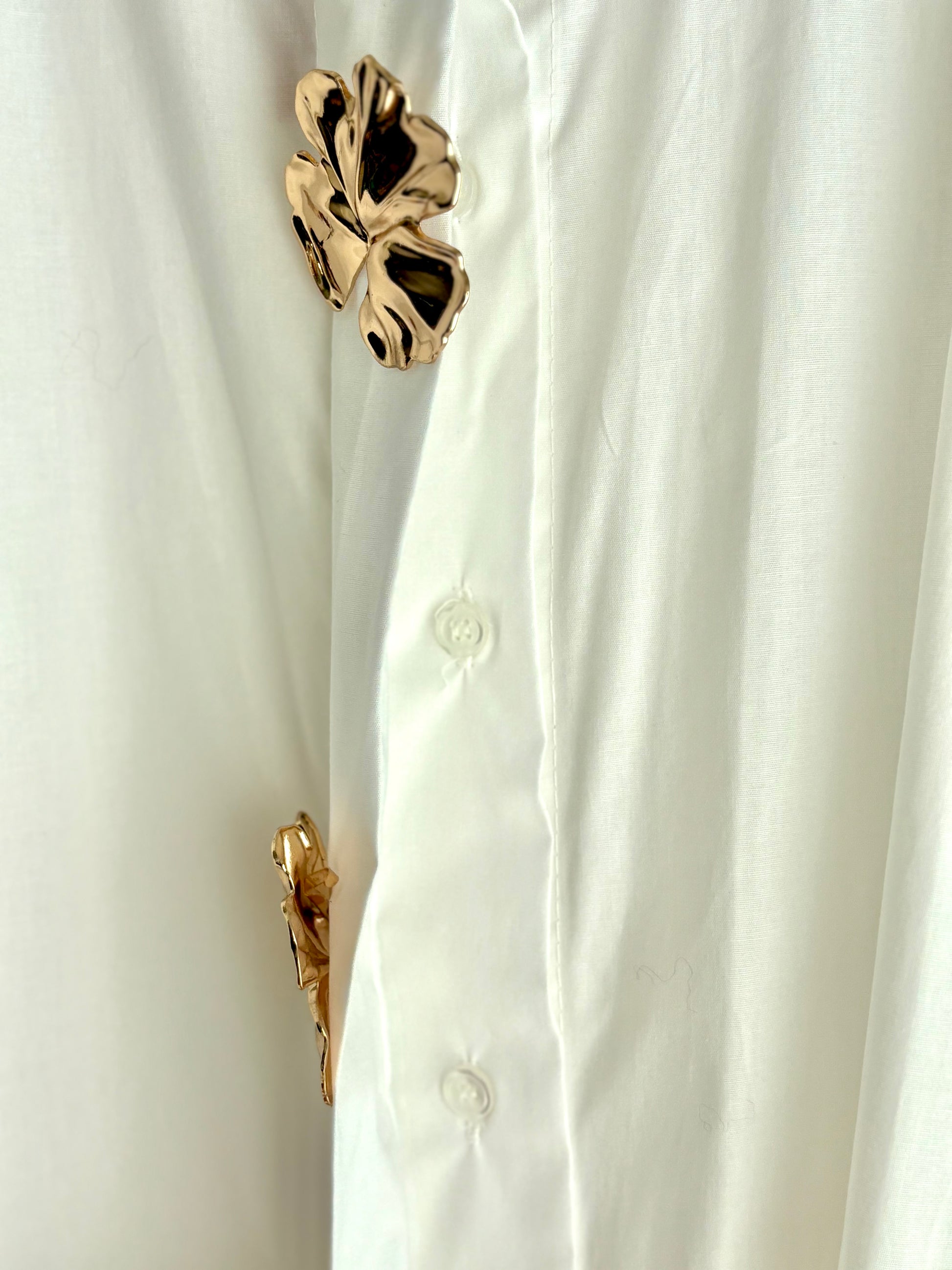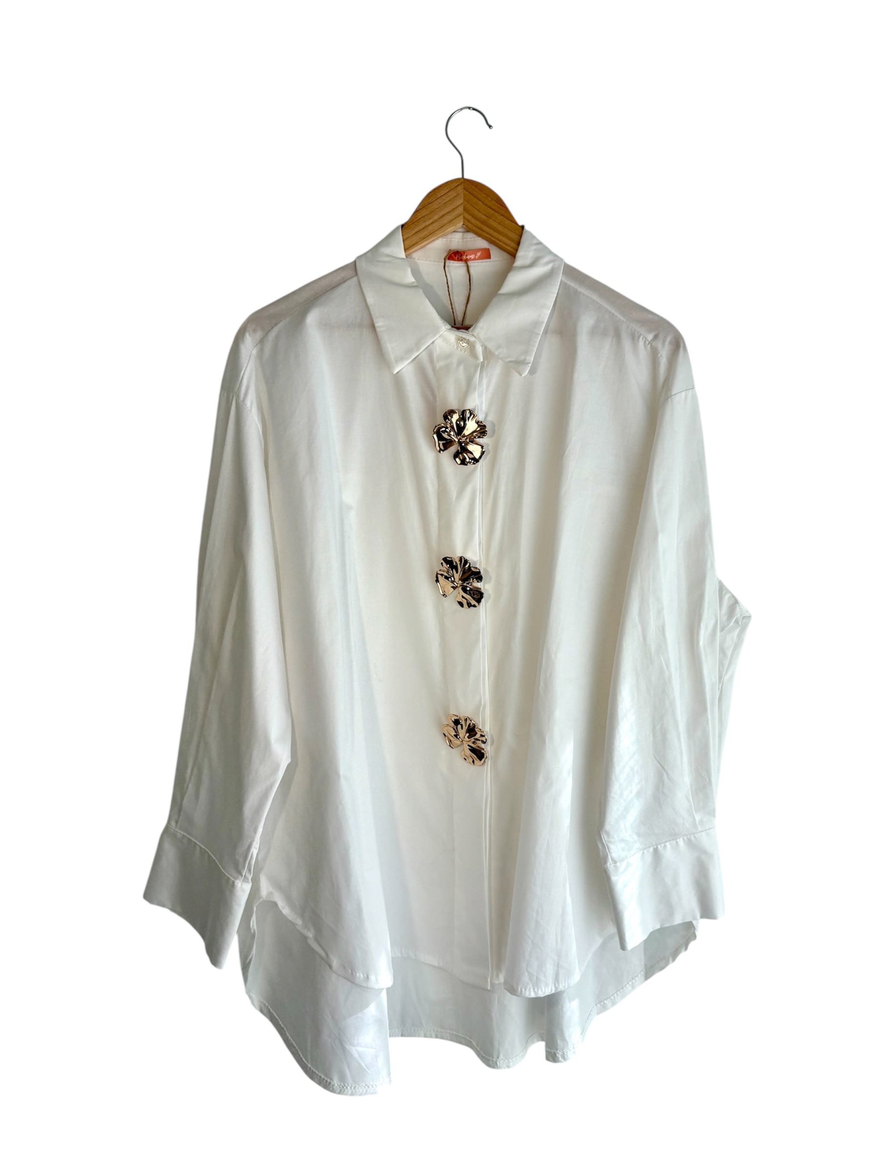 Elegância descomplicada todos os dias! Esta camisa larga oferece conforto e sofisticação, destacando-se pelos seus botões dourados em forma de aplique que acrescentam um detalhe distinto e luminoso. O corte solto garante liberdade de movimentos, tornando-a perfeita para qualquer ocasião.