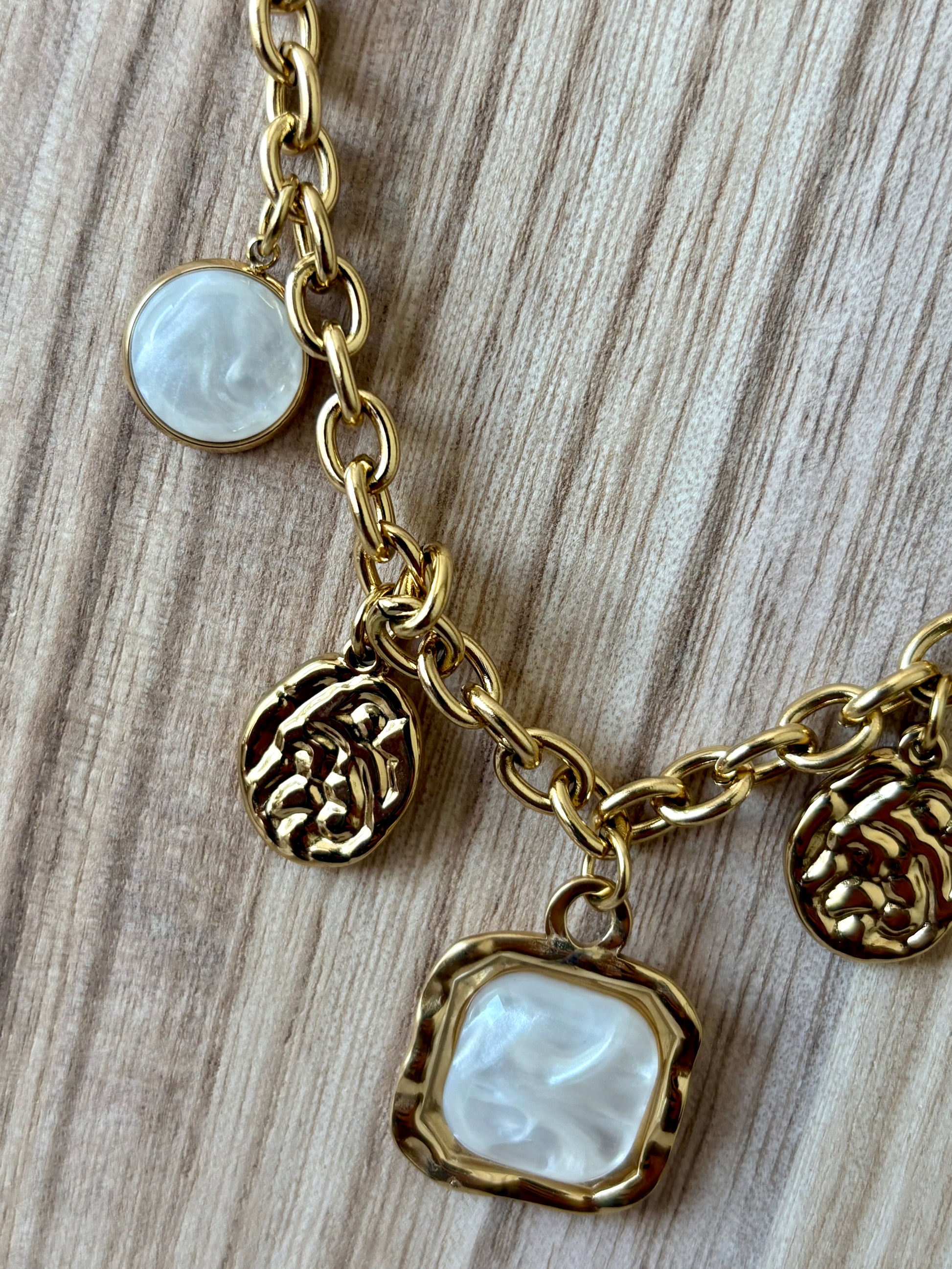 O Colar Charm Madrepérola é uma peça que encanta pela sua delicadeza e brilho natural! Os pendentes em madrepérola reflectem a luz de forma subtil, criando jogos de cor únicos que transmitem suavidade e elegância. Versátil e intemporal, é o acessório ideal para mulheres que procuram um toque de distinção no quotidiano ou desejam completar um look especial com requinte!