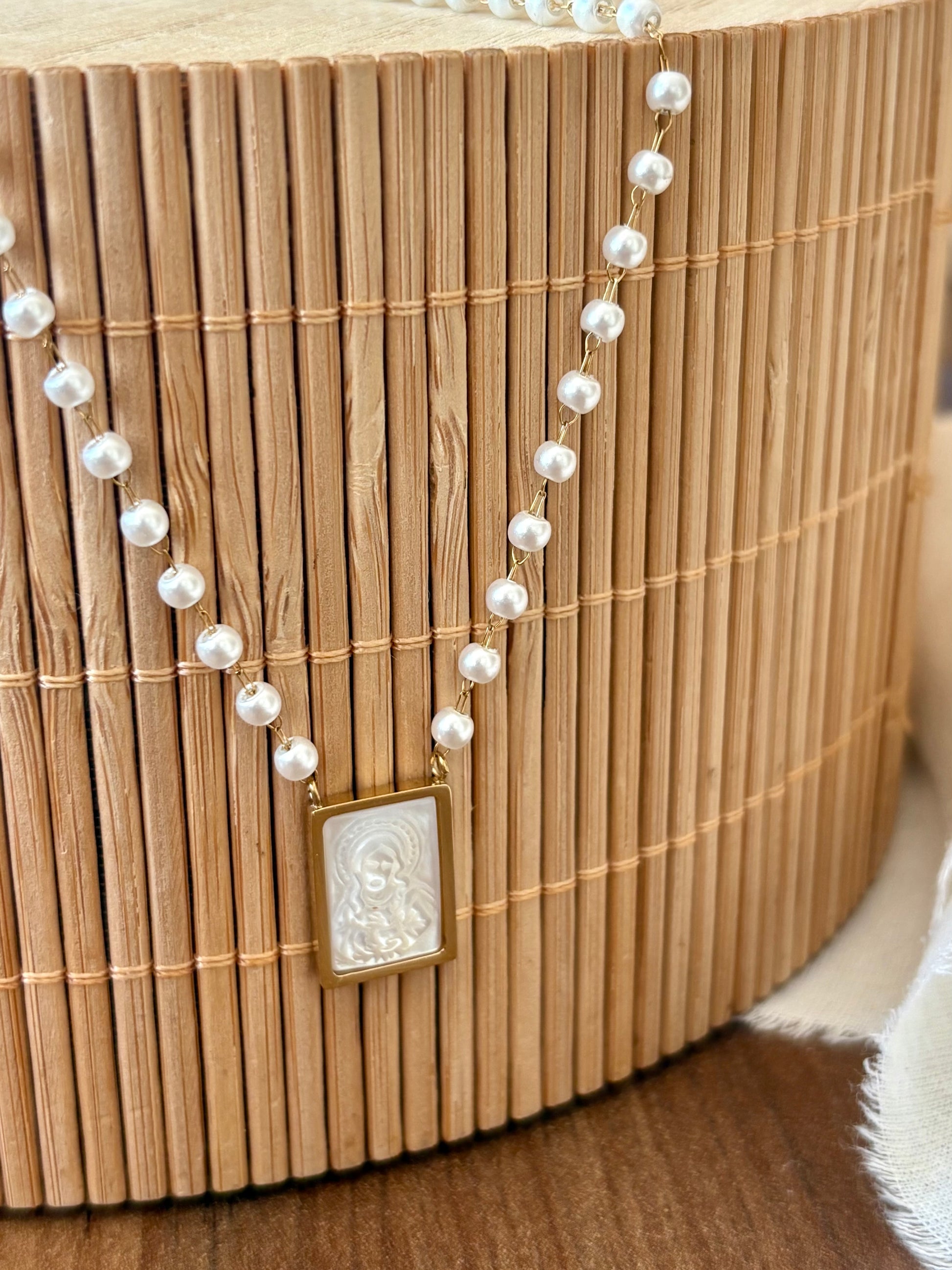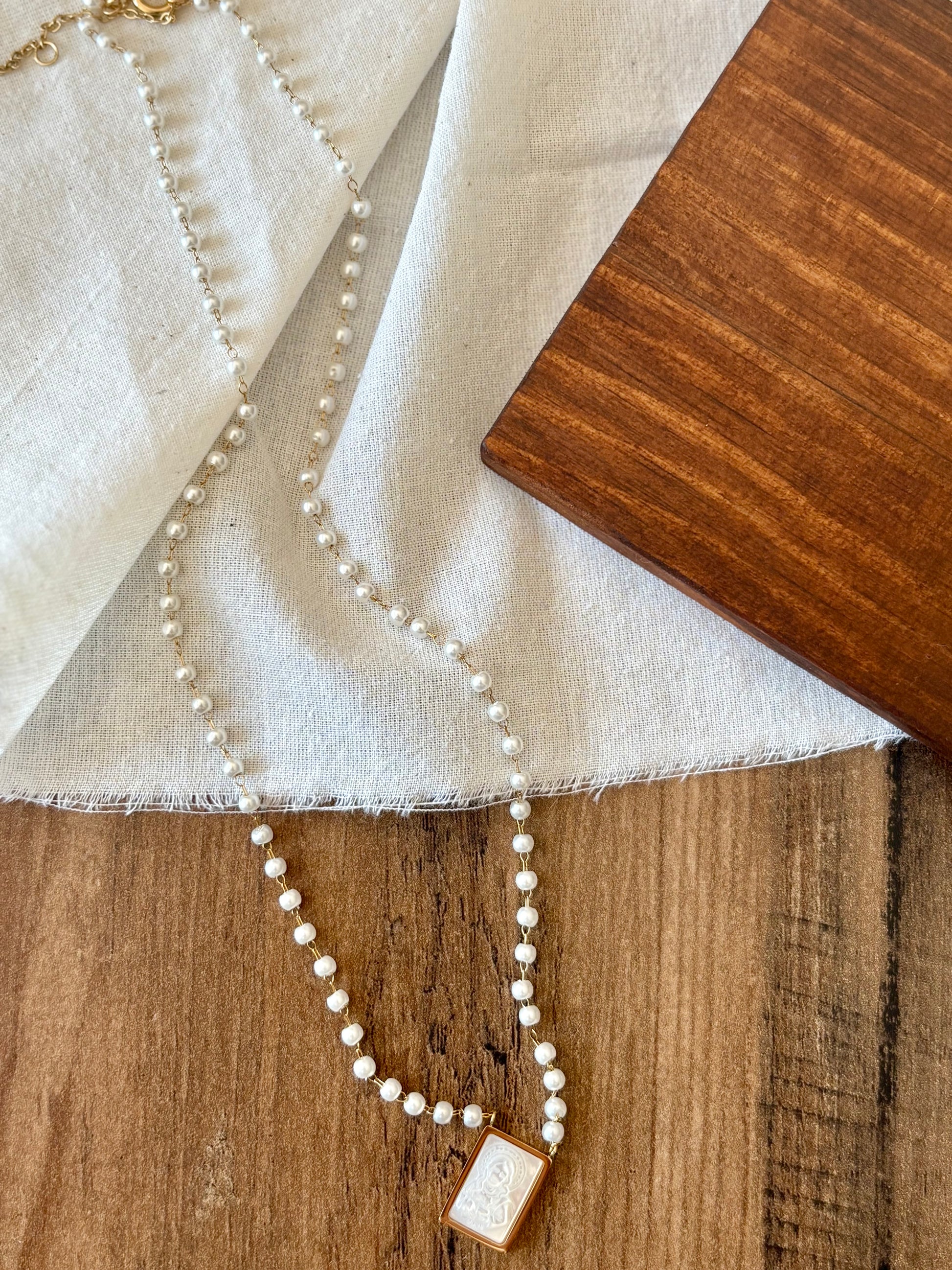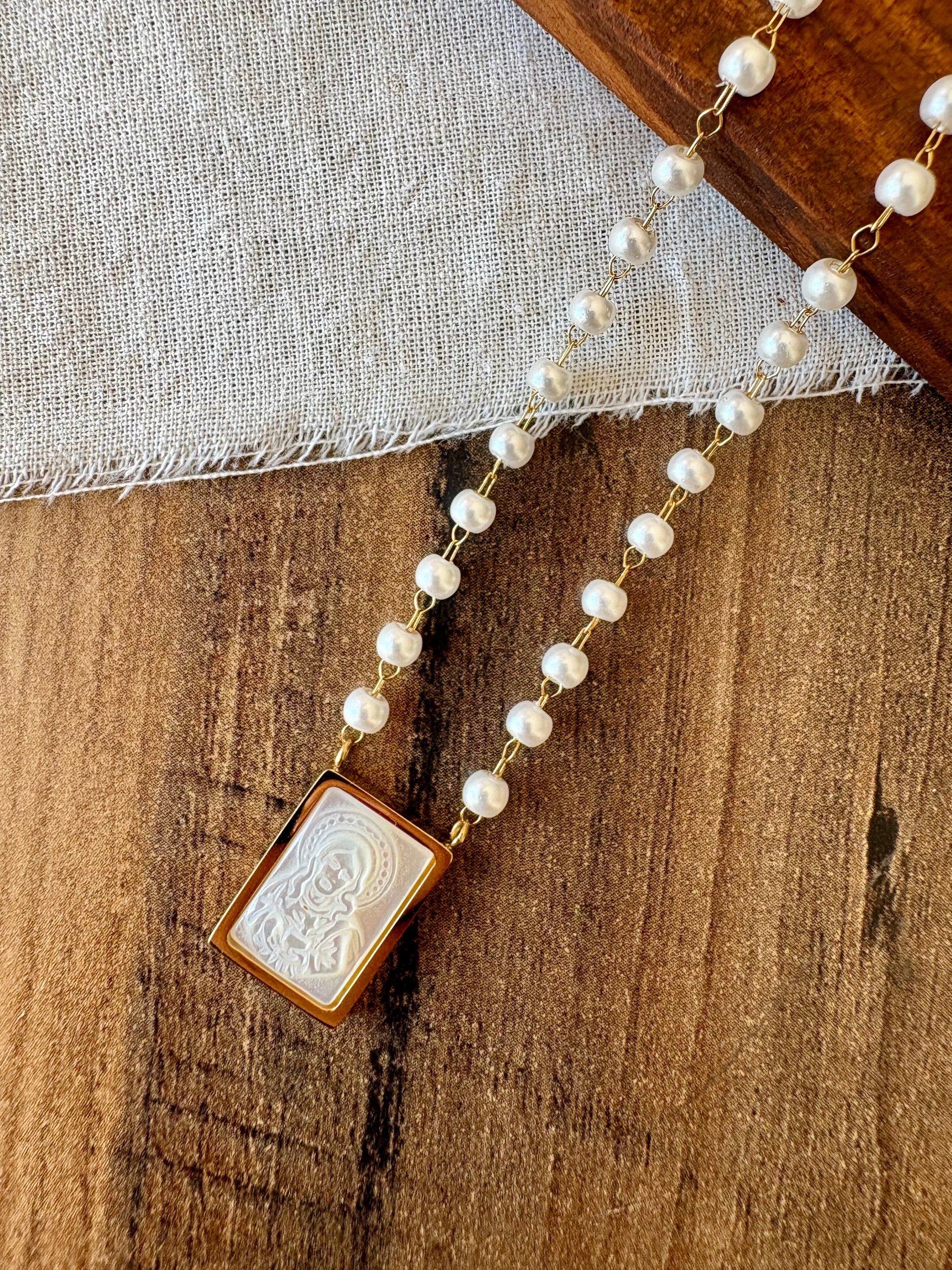 Um acessório que une delicadeza, fé e sofisticação. Este colar conta com um fio de pérolas que transmite elegância intemporal e um pendente retangular em madrepérola, com detalhe religioso em relevo, emoldurado em dourado. Mais que uma simples jóia, é uma peça que carrega significado espiritual e que pode acompanhá-la do dia-a-dia ou em ocasiões especiais.