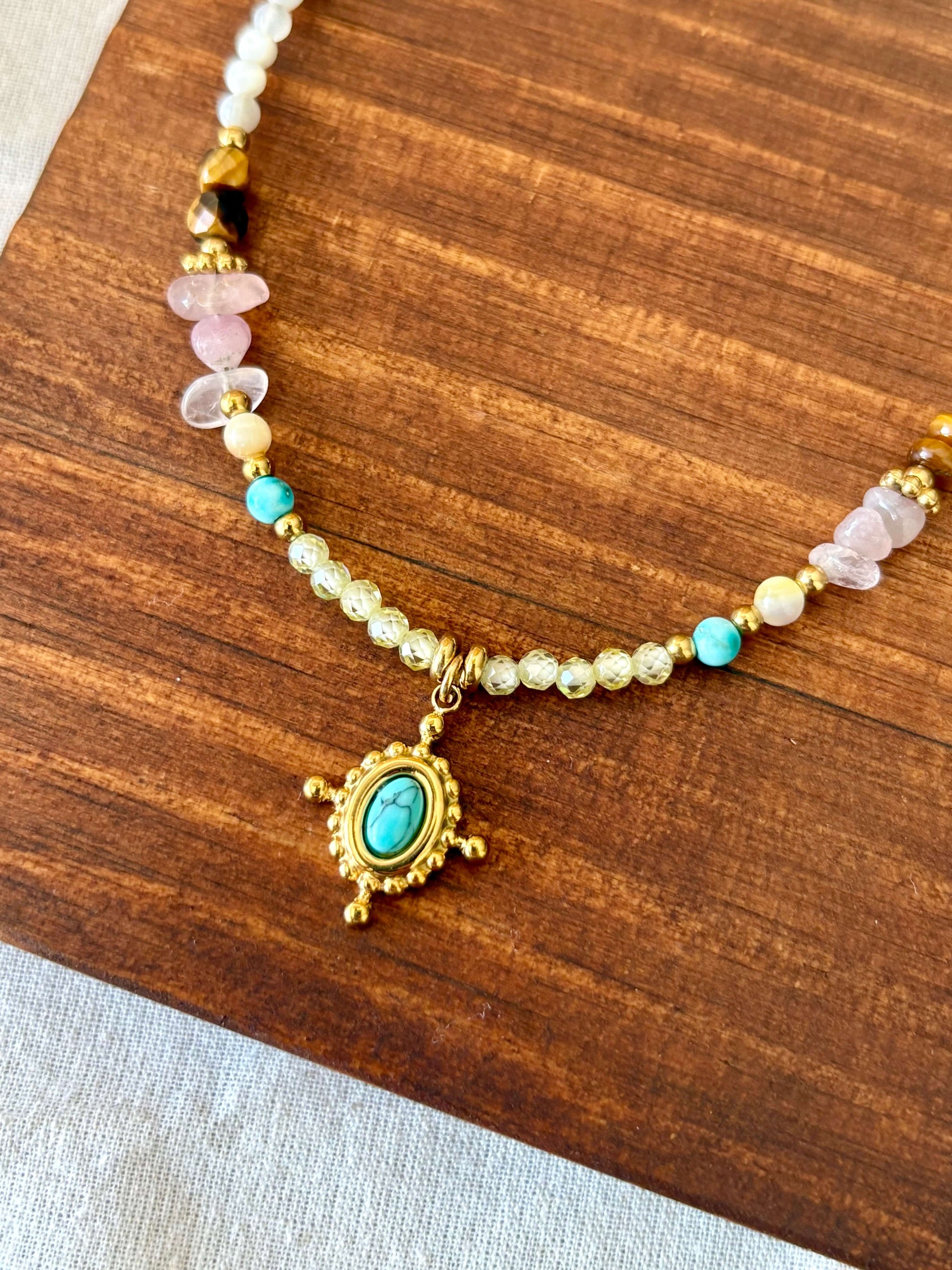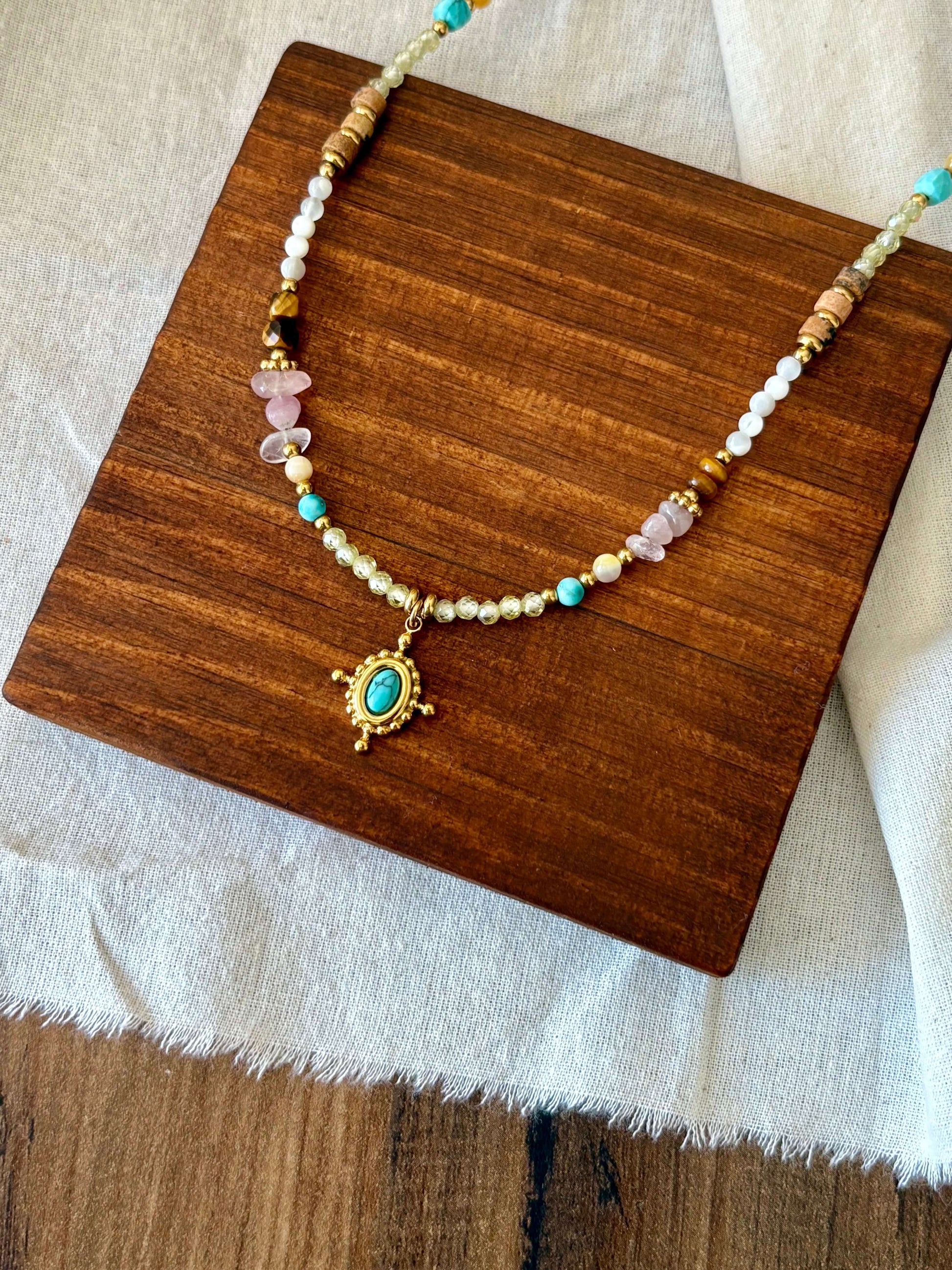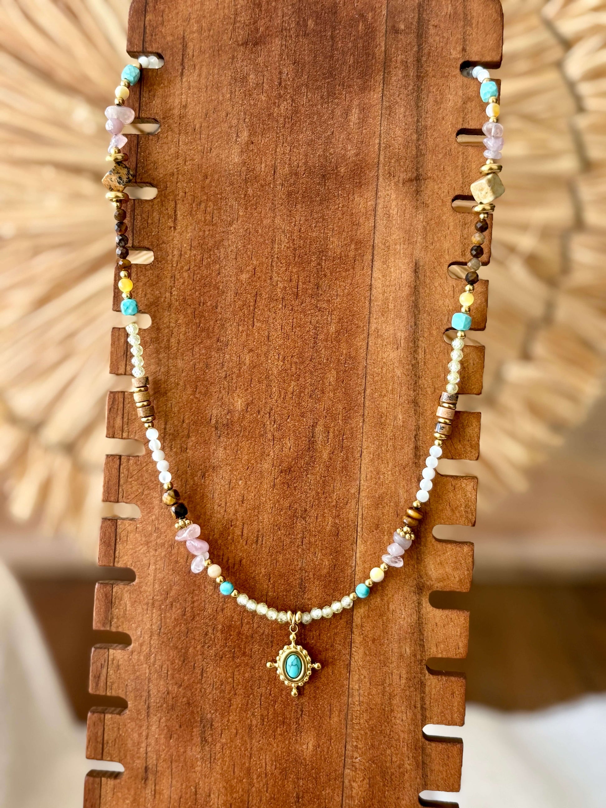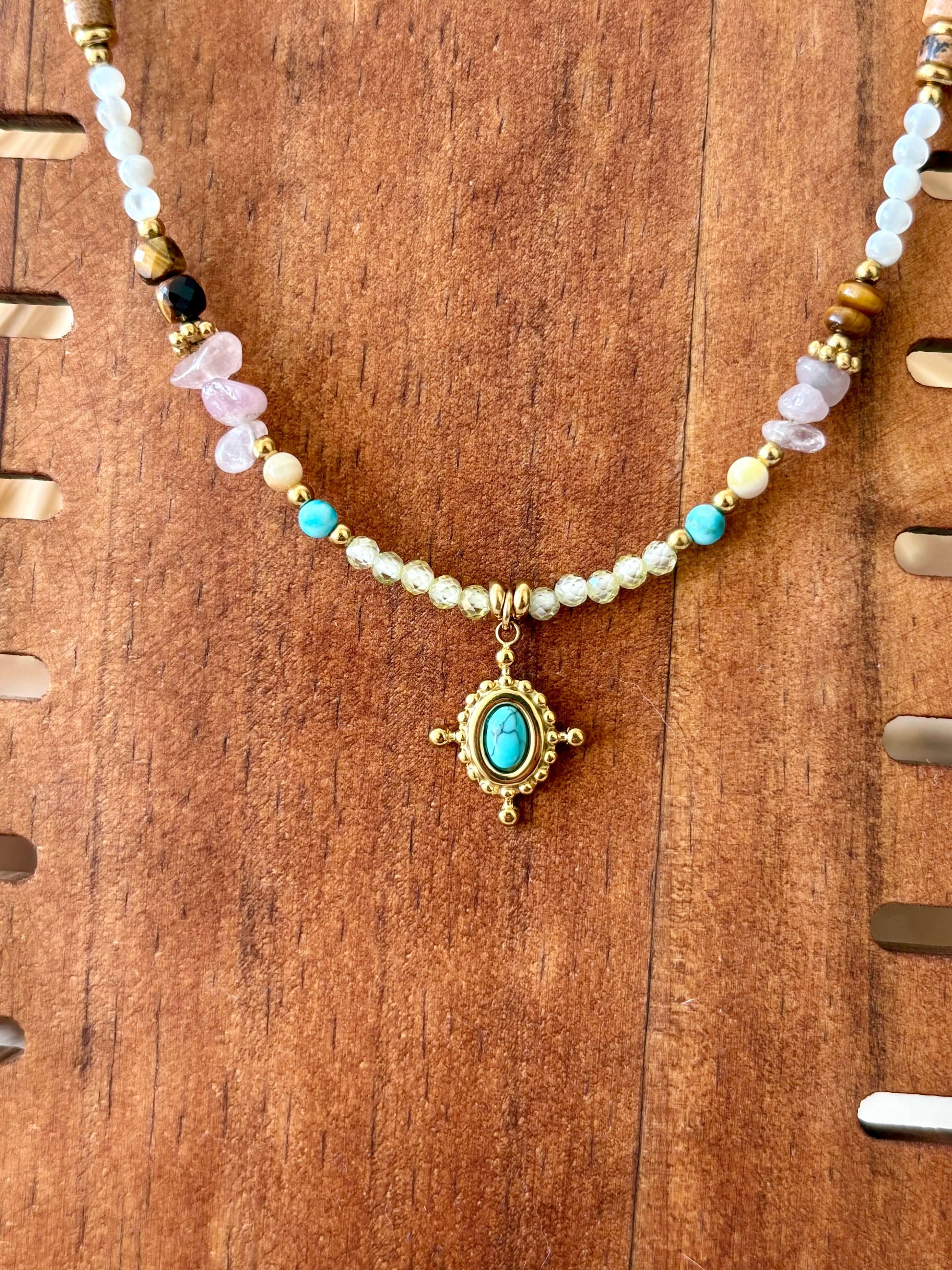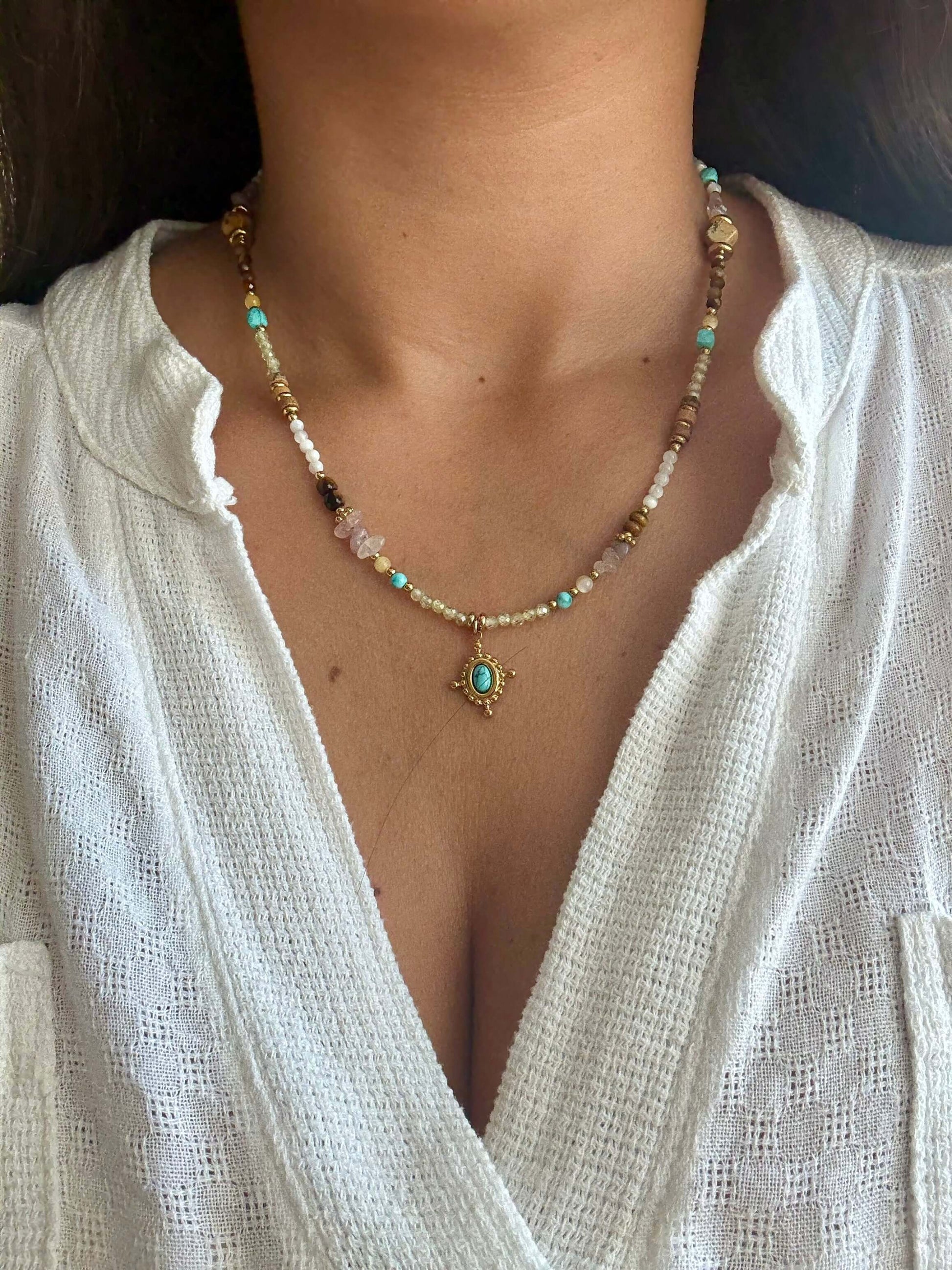 Adicione um toque de cor ao seu look com este colar vibrante, que combina o charme natural das contas com a energia única da pedra turquesa, conhecida por transmitir equilíbrio e proteção.