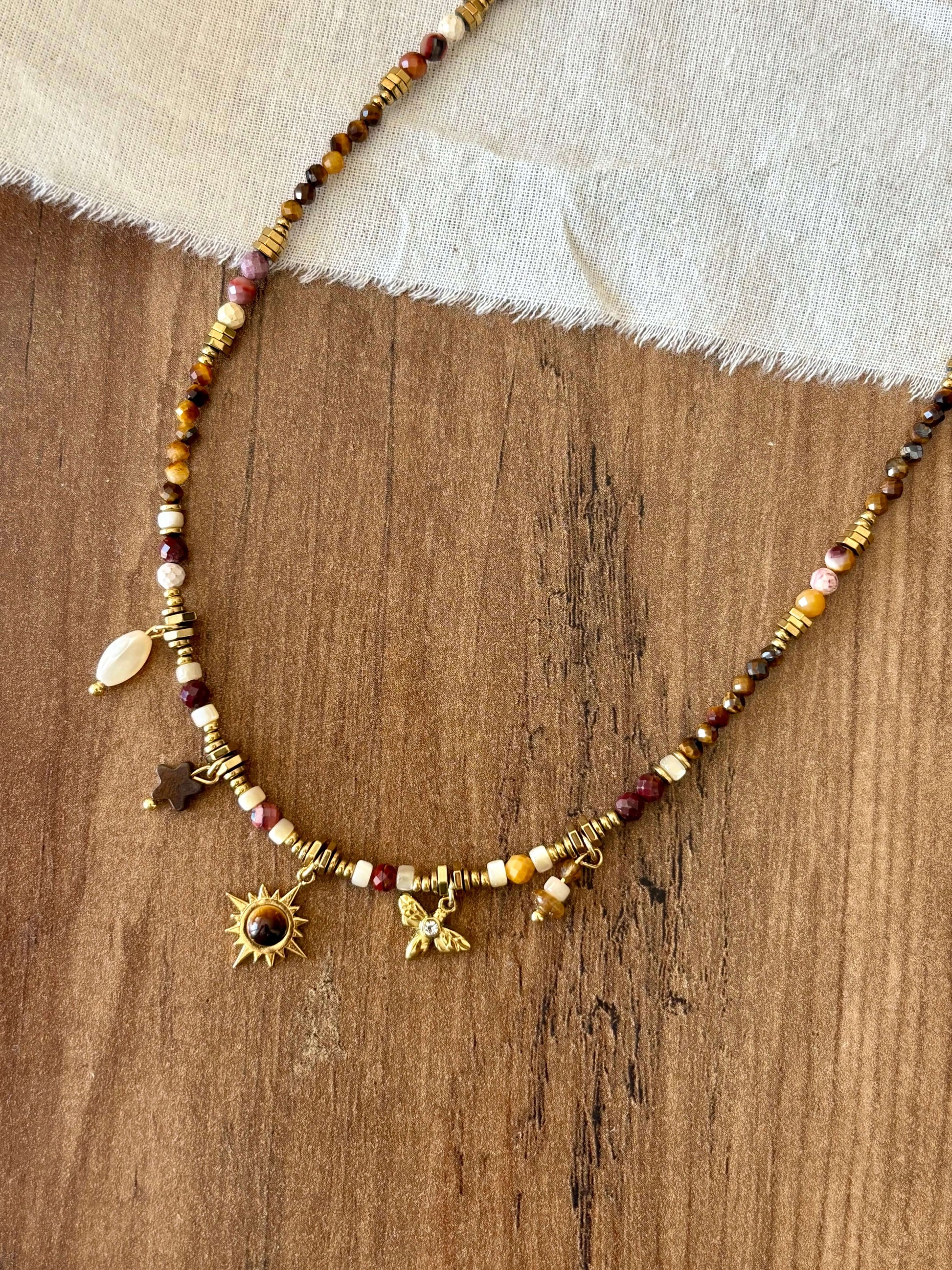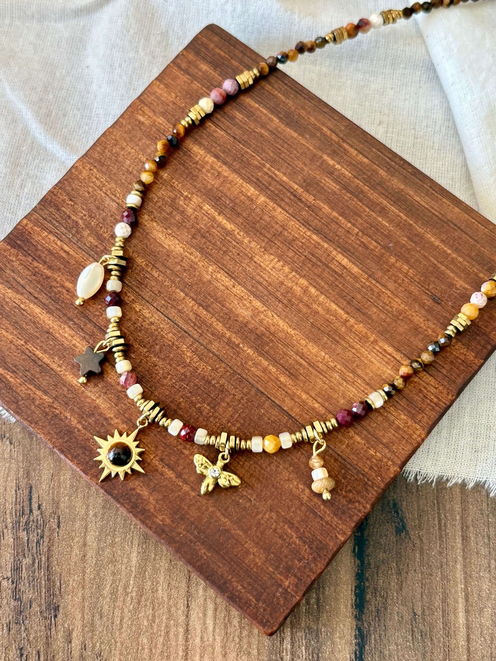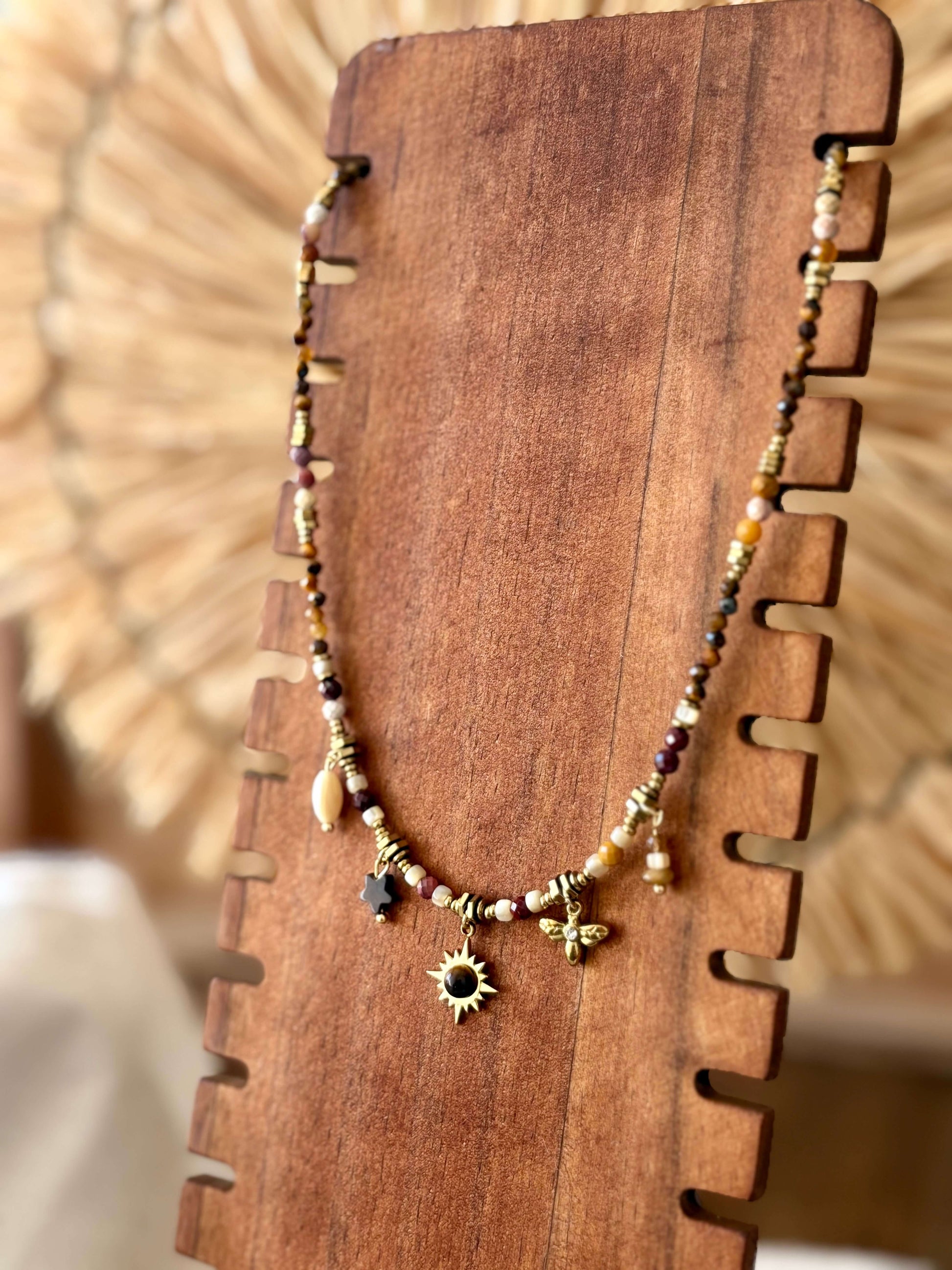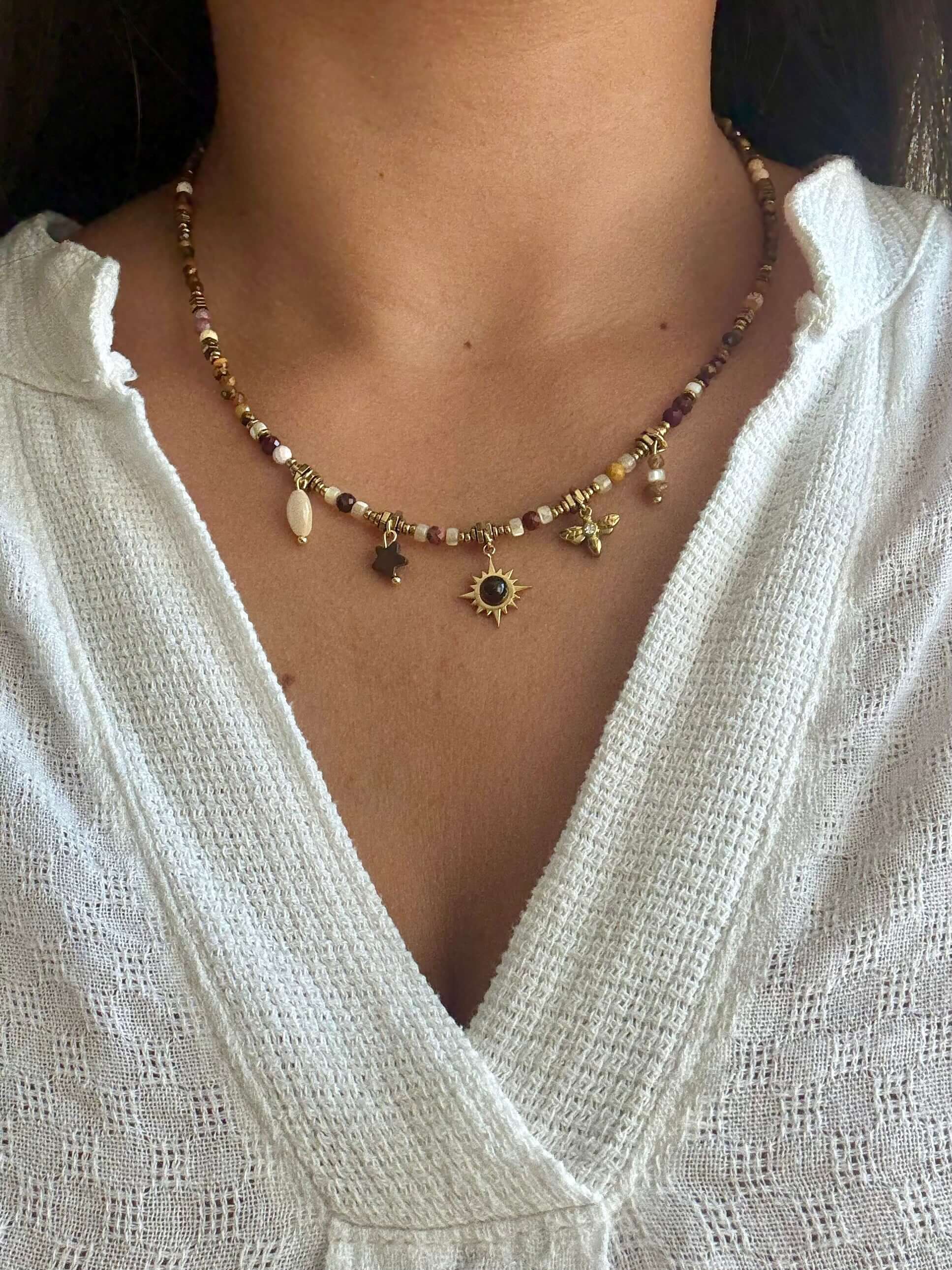Elegante e moderno, este colar combina a suavidade da cor malva com a força protetora e energética do olho de tigre, criando um acessório que transmite equilíbrio e estilo.
