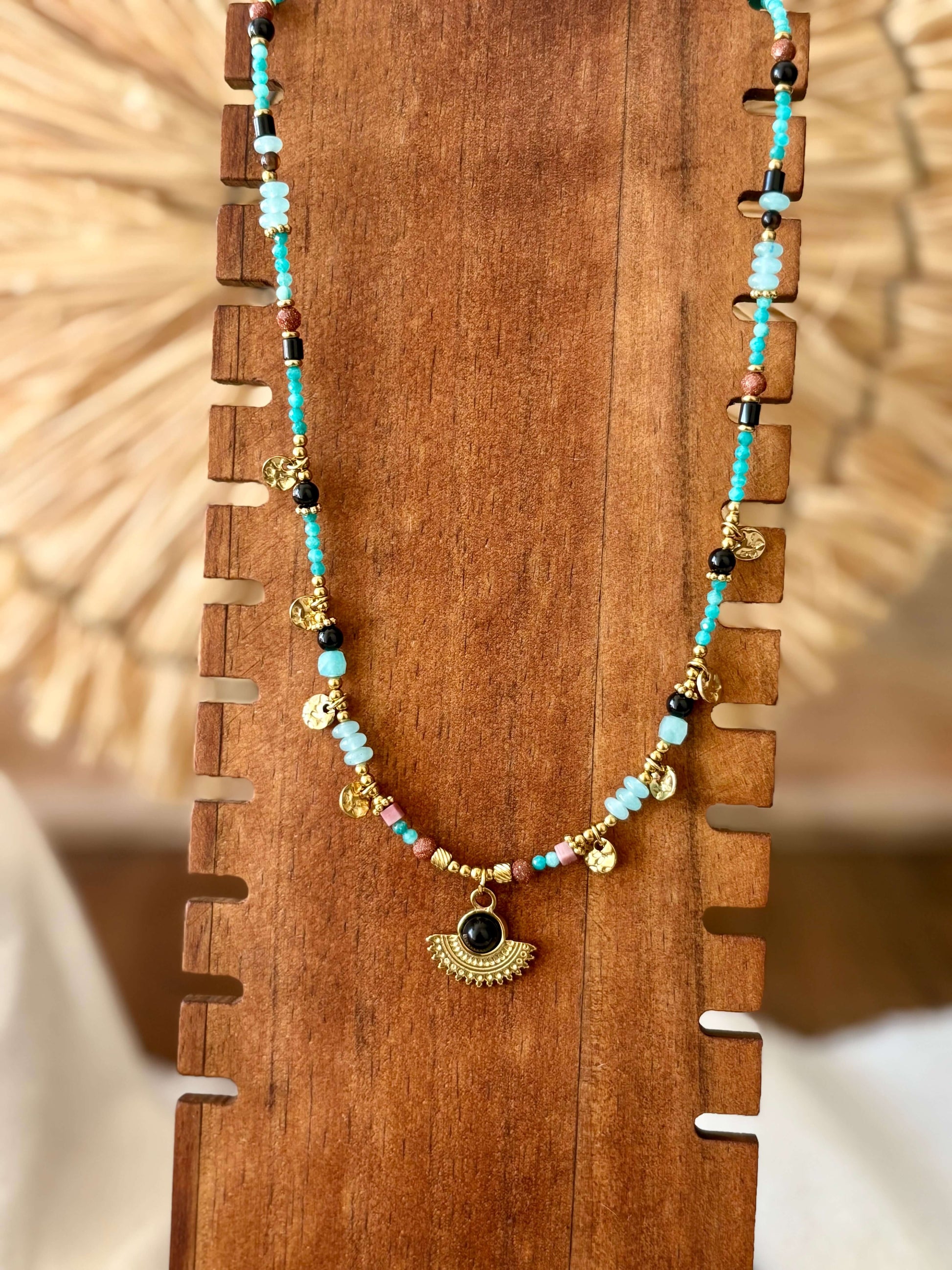 Destaque a sua personalidade com este colar de contas turquesa, realçado por um pendente de inspiração étnica. Cada detalhe combina cor, textura e autenticidade, criando um acessório único que transmite estilo e energia positiva.