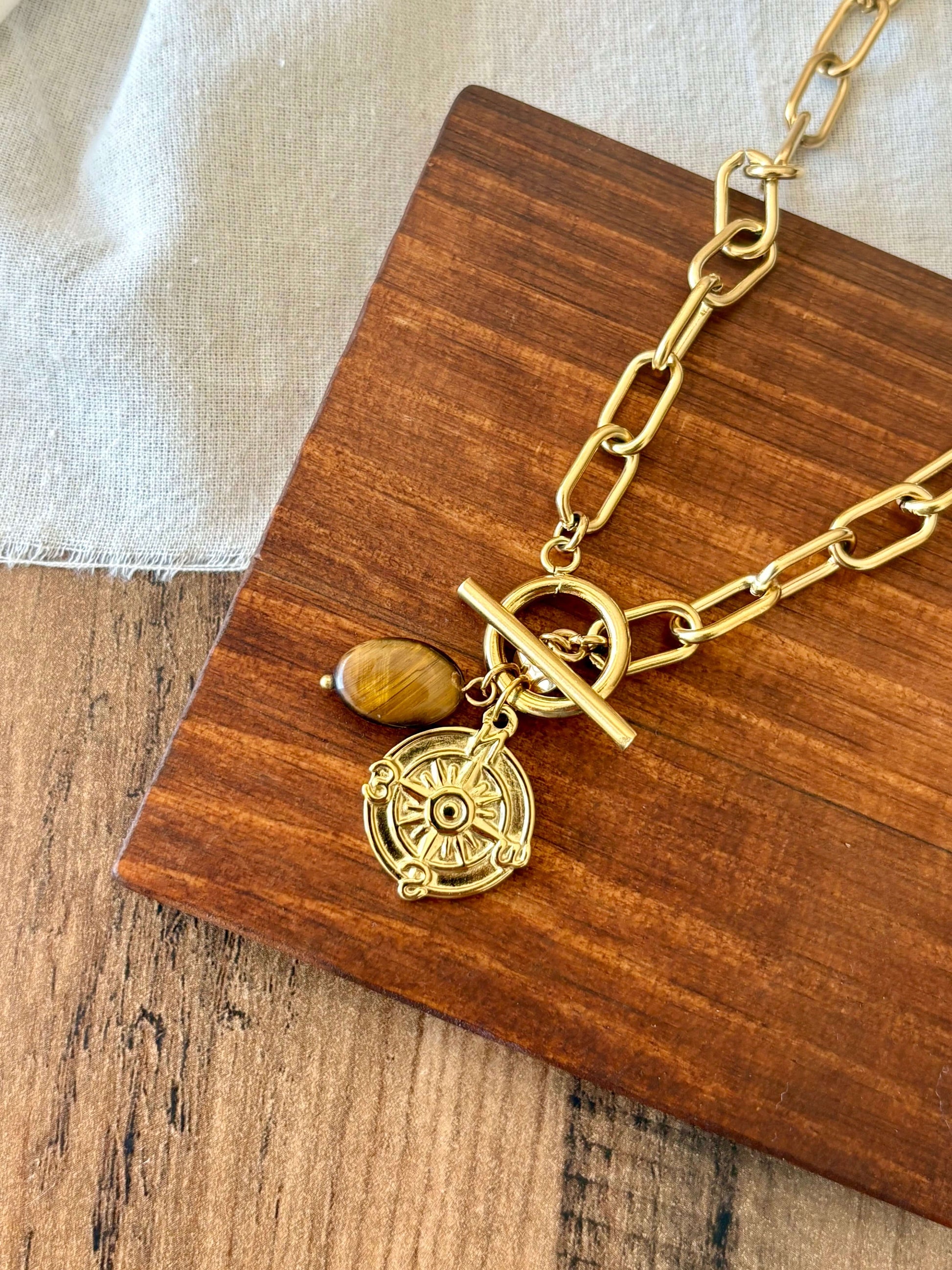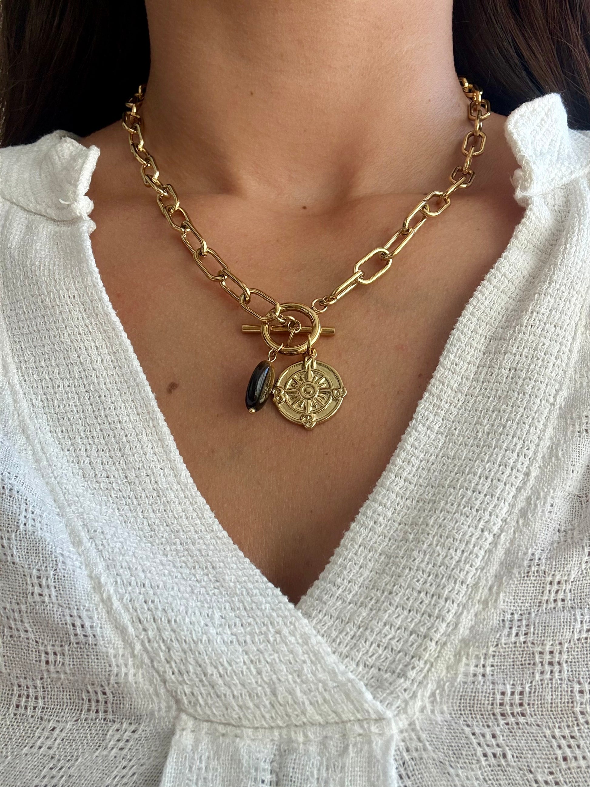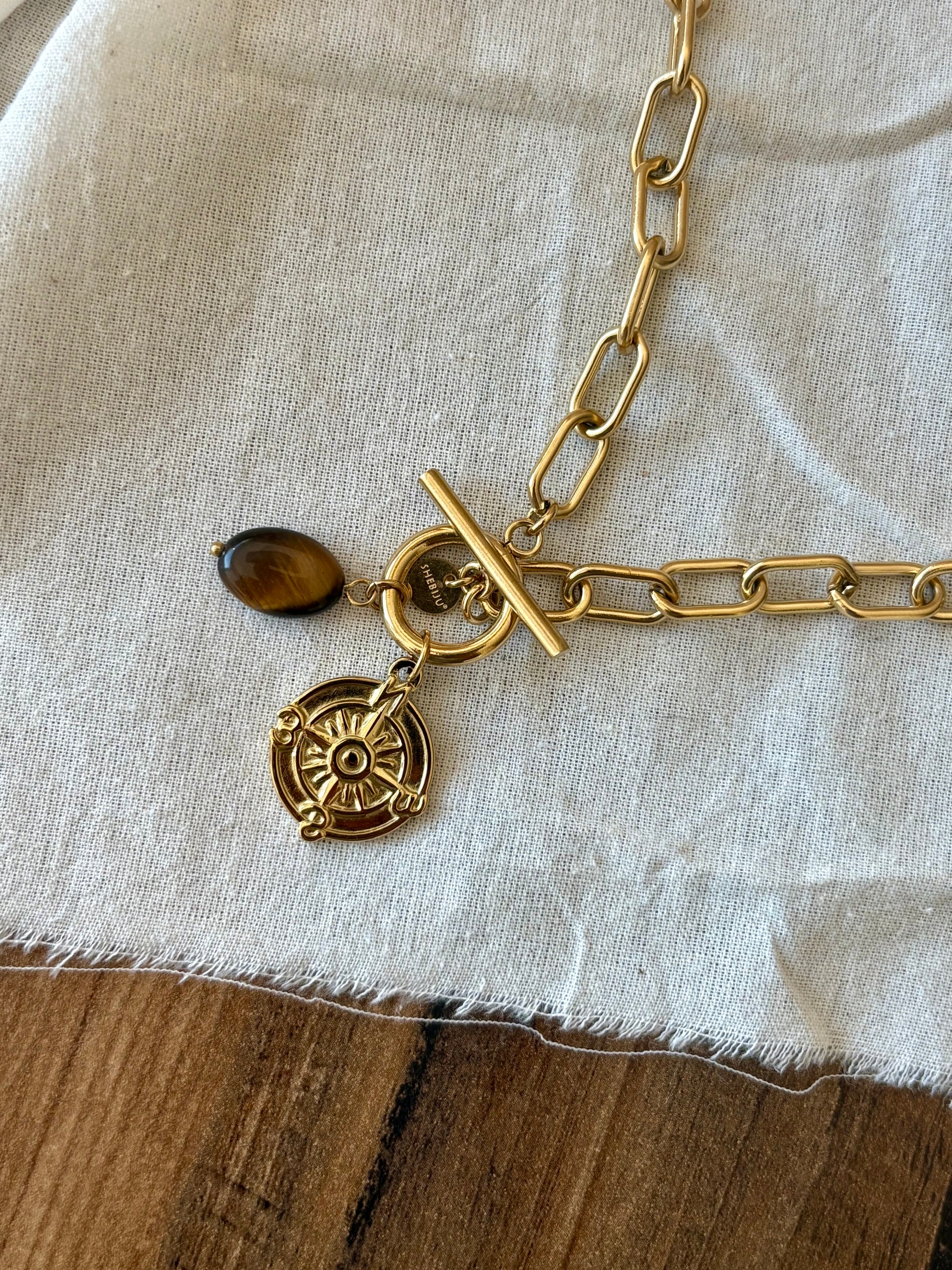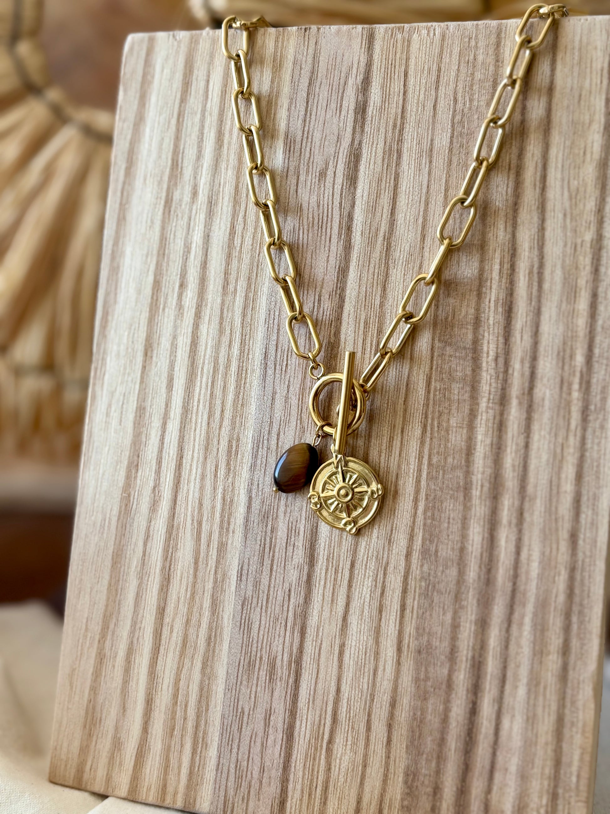 O colar Rosa dos Ventos é o acessório perfeito para mulheres livres, sonhadoras e sofisticadas! Com uma corrente larga e dourada, conta com um pendente com uma rosa dos ventos e uma pedra natural em tons de preto e castanho, representando a sua versatilidade e toque de sofisticação.