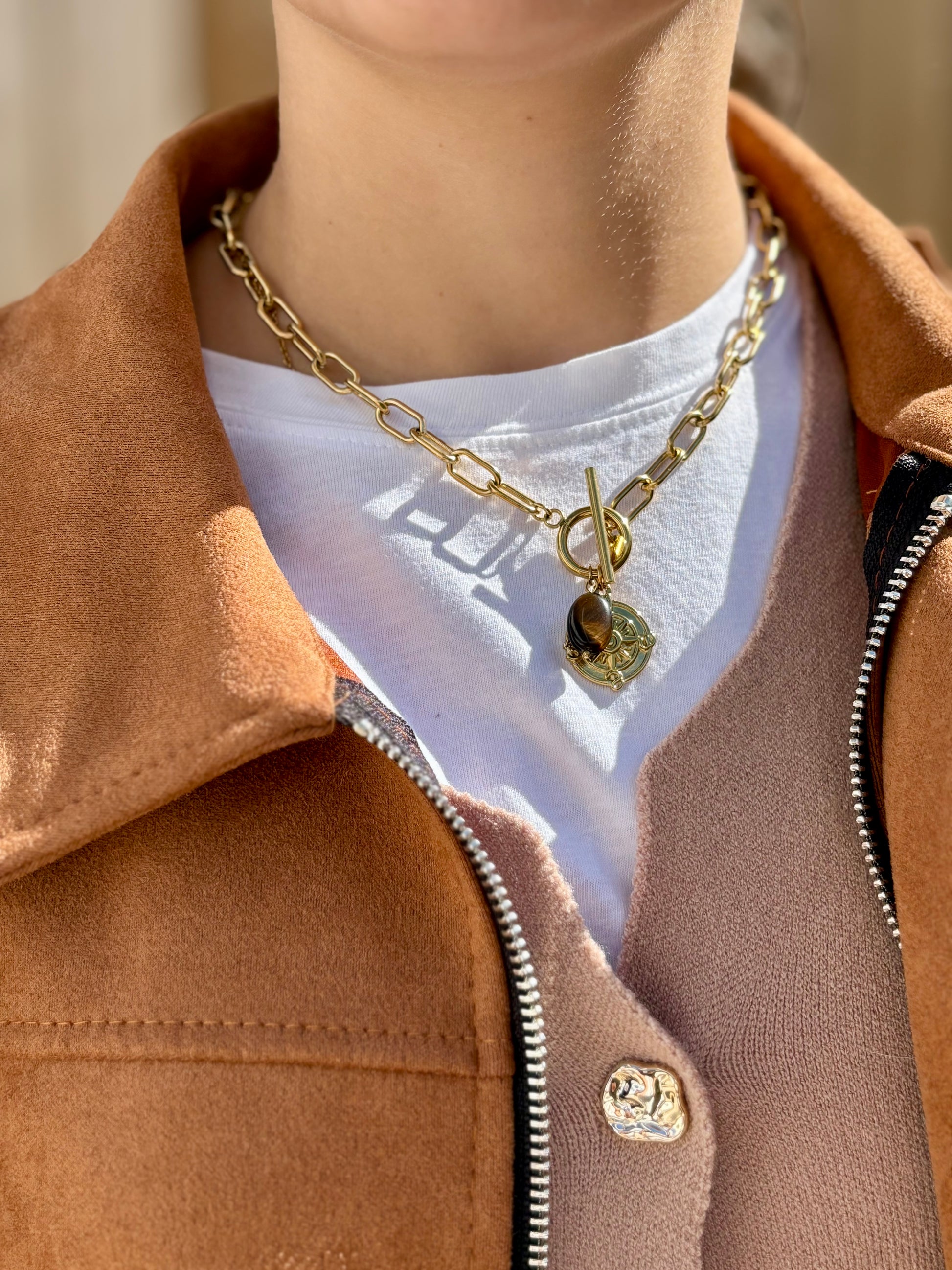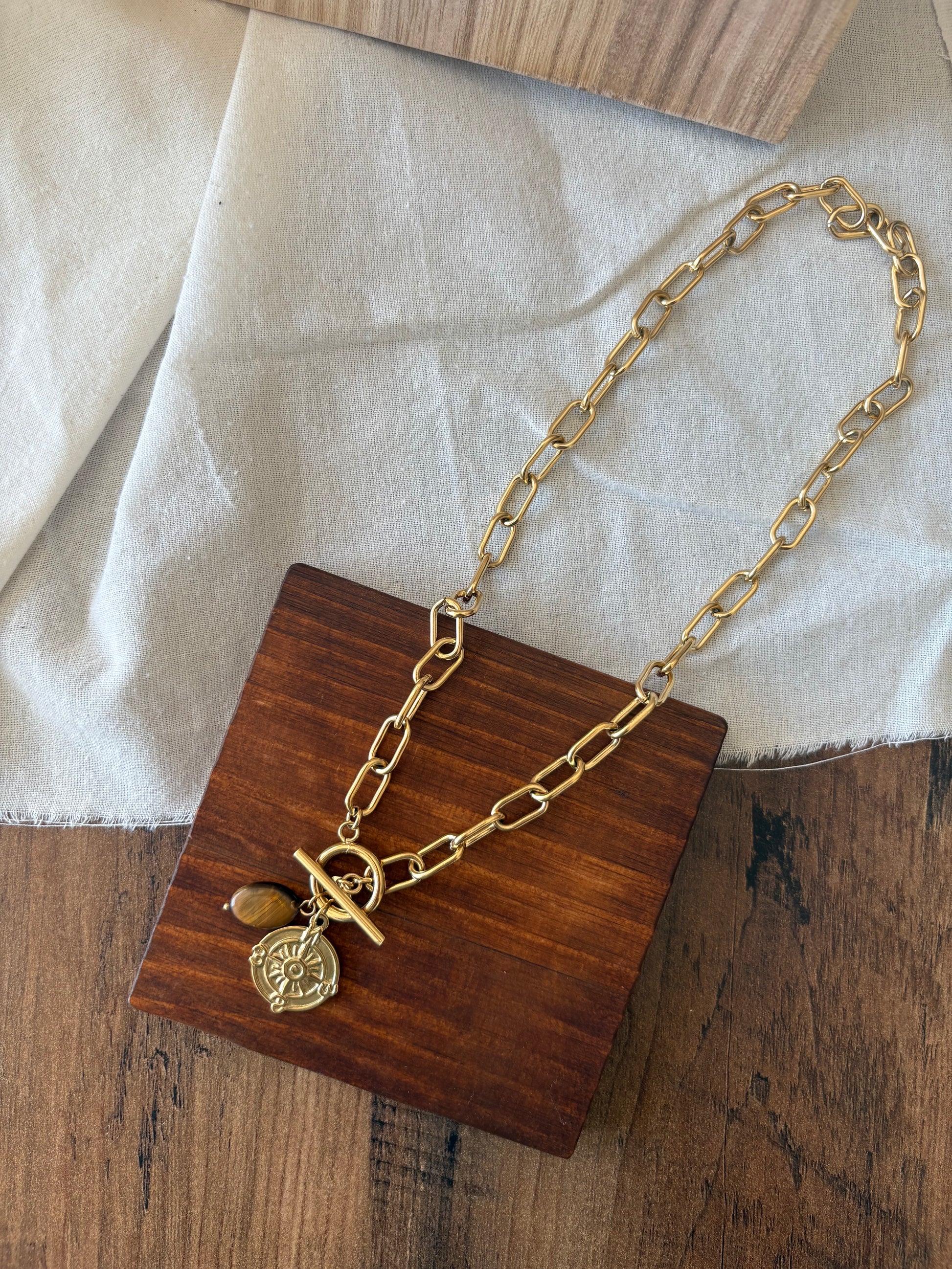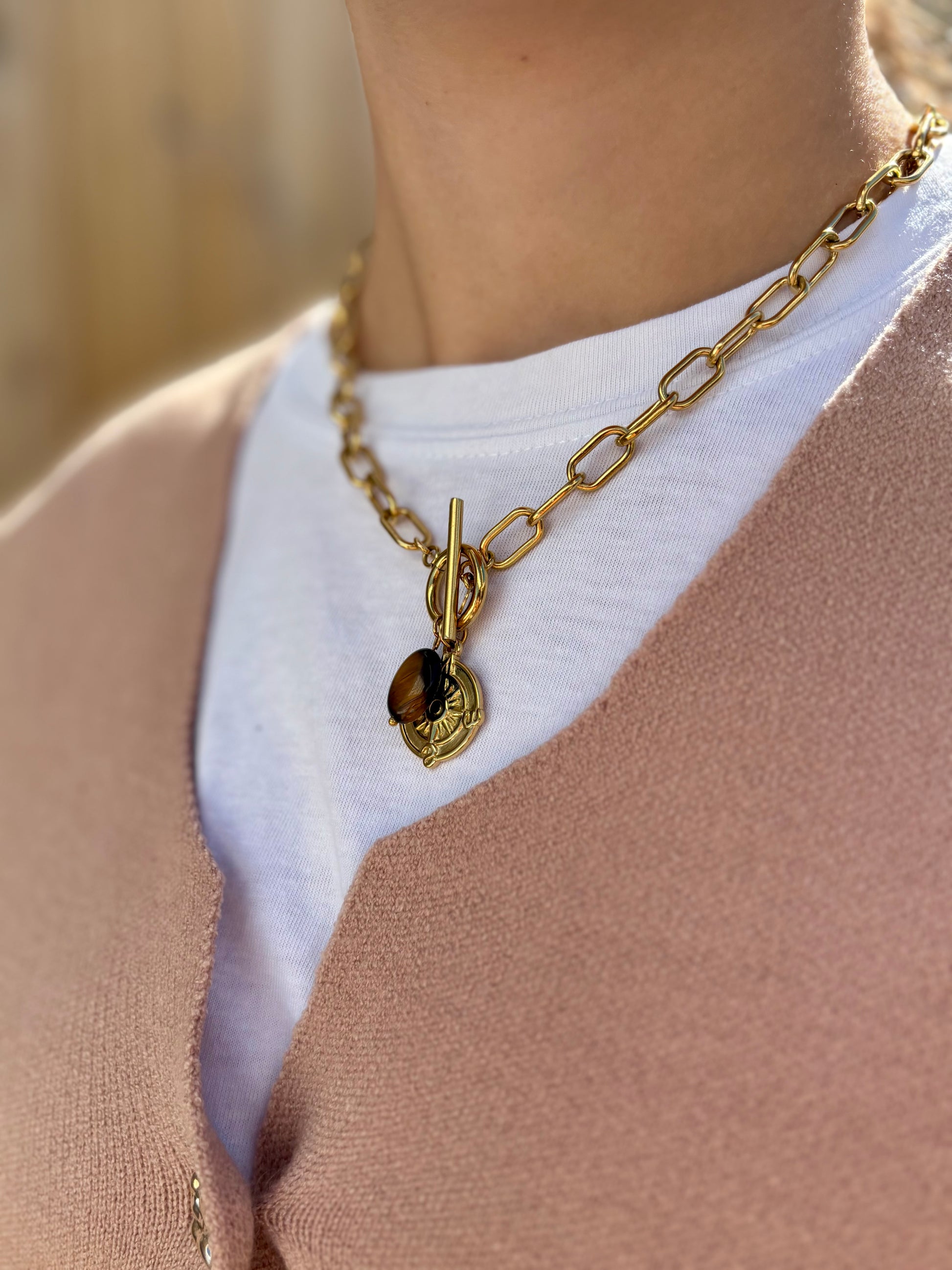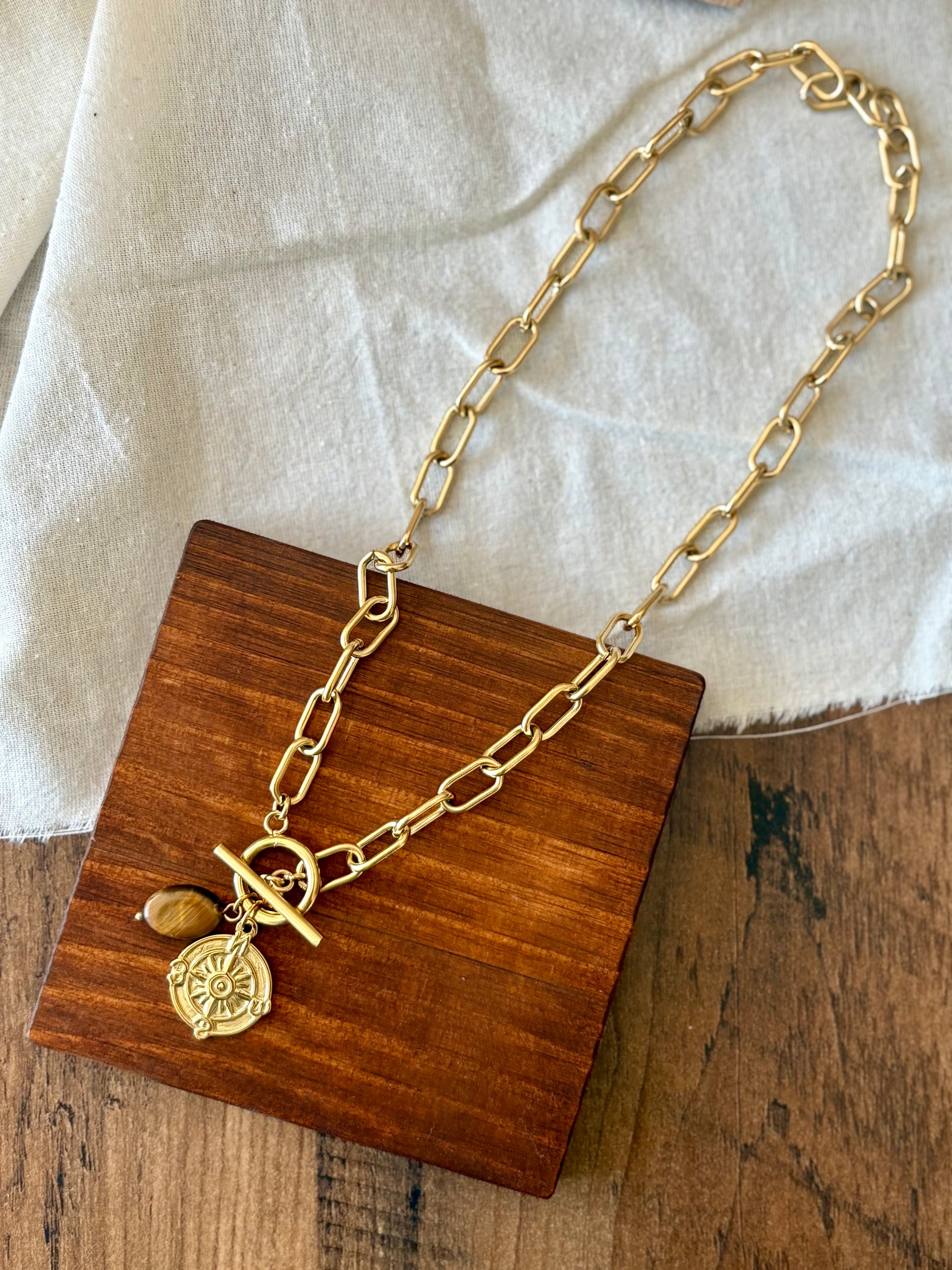O colar Rosa dos Ventos é o acessório perfeito para mulheres livres, sonhadoras e sofisticadas! Com uma corrente larga e dourada, conta com um pendente com uma rosa dos ventos e uma pedra natural em tons de preto e castanho, representando a sua versatilidade e toque de sofisticação.