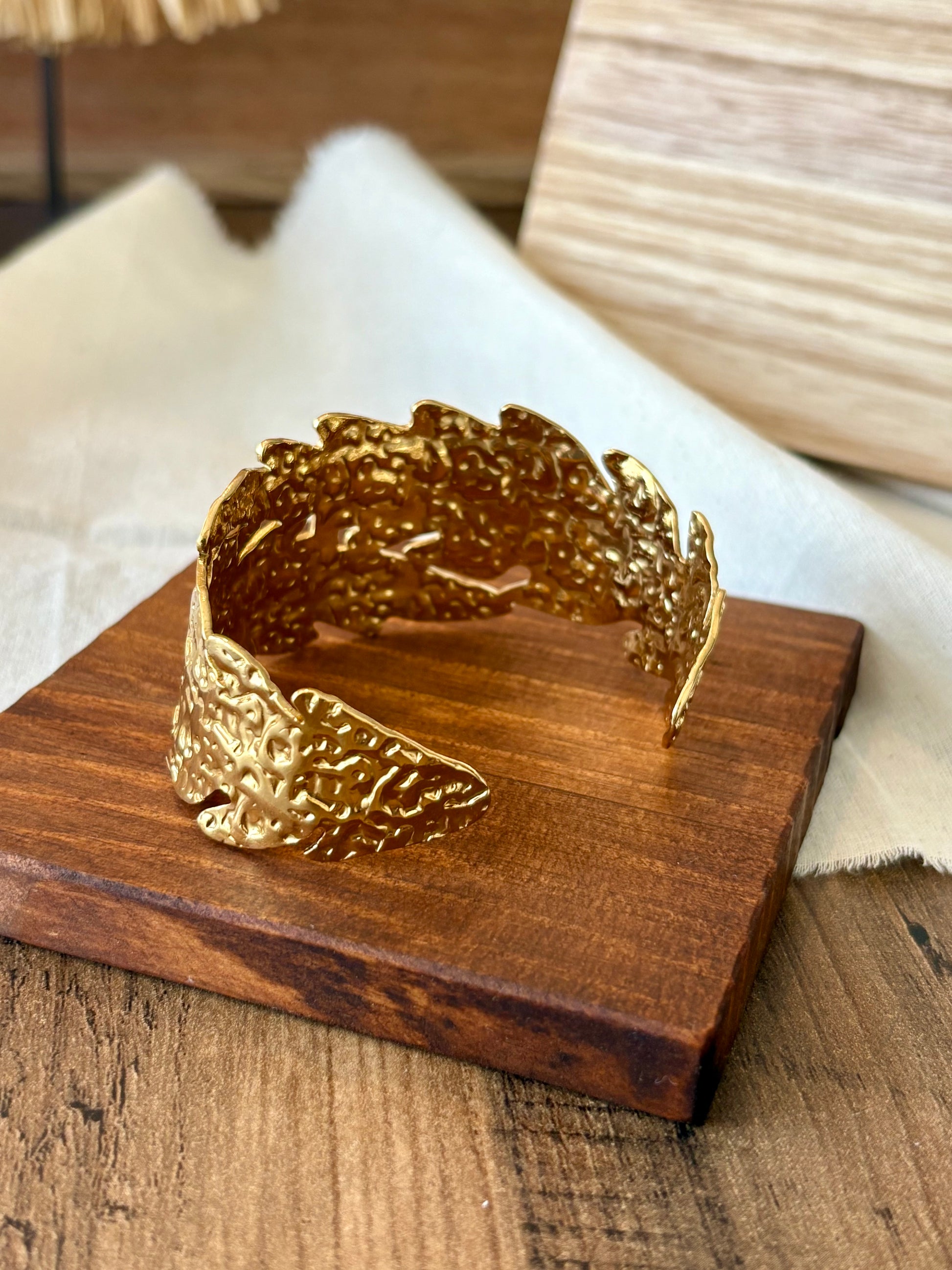 Uma peça imponente que alia sofisticação e ousadia. Esta pulseira rígida dourada apresenta um design recortado e texturizado que capta a luz de forma única, transformando-a no acessório perfeito para completar qualquer look!